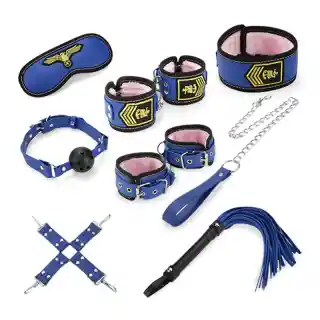 CARACTERÍSTICAS: -Kit de accesorios eróticos FETISH (9 piezas) -Incluye: Bola Gag, Tapa Ojos, Sujetadoras pies y manos, Cuello, Cuerda de amarres, Látigo, cruceta y pezoneras -Color:Azul -Tamaño: Unisex