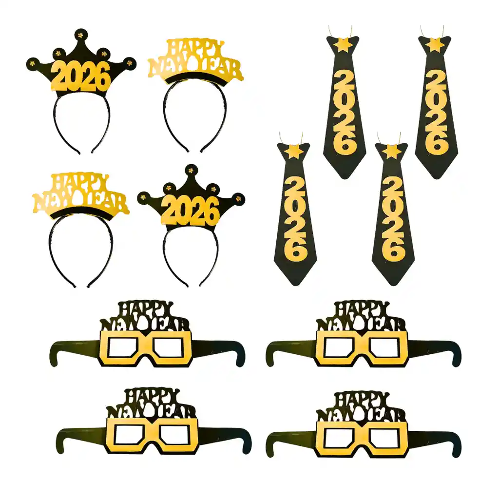 Kit de Fiesta Feliz Año Nuevo 2026 Incluye: 12 piezas (diademas, gafas y corbatas) (Diseños surtidos según disponibilidad) ¡Da la bienvenida al Año Nuevo con nuestro Kit de Fiesta Feliz Año Nuevo 2026! Características: - Ideal para fiestas de fin de año, reuniones, eventos sociales y sesiones de fotos. - Accesorios livianos y cómodos, ideales para usar durante toda la celebración. - Perfecto para fotos grupales, brindis de medianoche y celebraciones familiares. - Fácil de combinar con otros elementos de decoración de Año Nuevo. ¡Haz que tu celebración de Año Nuevo sea única, divertida y llena de estilo!