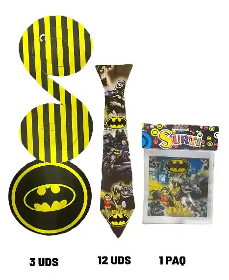DECORACION PARA FIESTA DE BATMAN, INCLUYE 1 PAQUETE DE SERVILLETAS, 12 CORBATAS Y 1 PAQUETE DE 3 ESPIRALES.