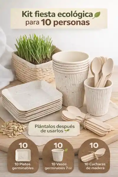 Todo lo que necesitas para una celebración sostenible. Usa y luego siembra tus empaques 🌱 “plántalo después de usarlo” 👉 10 platos torteros germinables 👉 10 vasos 7 oz germinables 👉 10 cubiertos