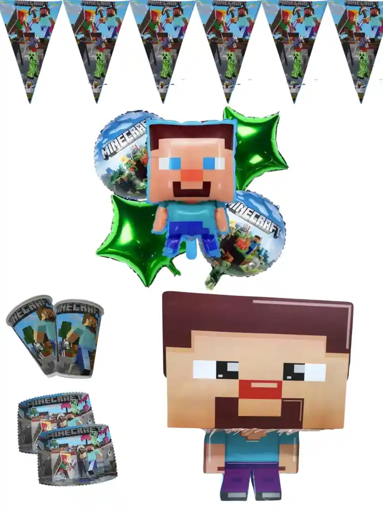 Kit de decoracion MINECRAFT 1 banderin largo de 3 metros aproximados 12 vasos 12platos 1 piñata 5 globos metalizados grandes los globos se envian sin inflar si deseas algo adicional indicanos y con gusto te colaboramos