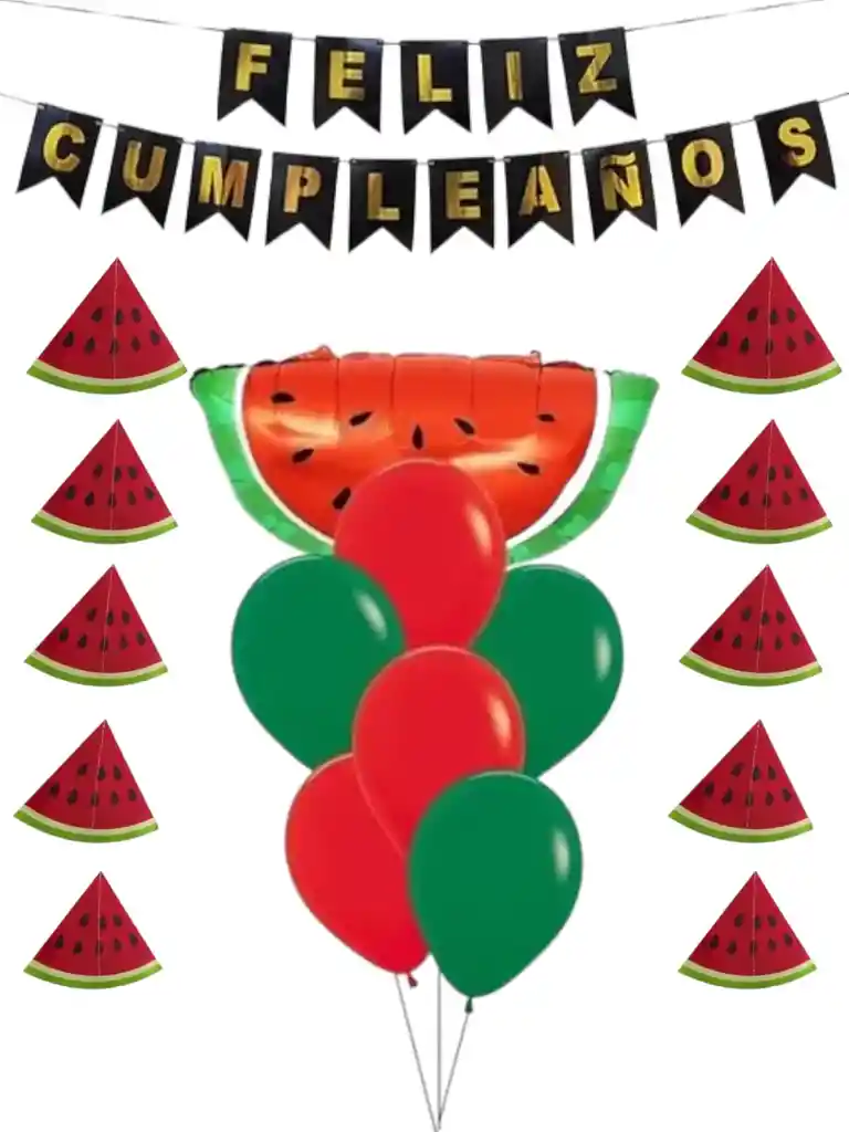 Kit de Fiesta Sandia, listos para celebrar contendido: 2 guirnaldas verticales de sandias, 2metros c/u 1 banderin Feliz rojo o negro a eleccion 1 globo sandia 48*67cm 6 globos de látex R12 Rojo y verde Disponibilidad inmediata Si deseas adicionar otros Articulos a tu compra puedes escribirnos, para poder ayudarte. - En ciudades fuera de Bogotá despachamos para el mismo día si compras antes de las 12AM - En Bogotá despachamos para el mismo día, si haces el pedido antes de las 2 PM recuerda q tenemos muchos productos disponibles para tener una linda celebracion