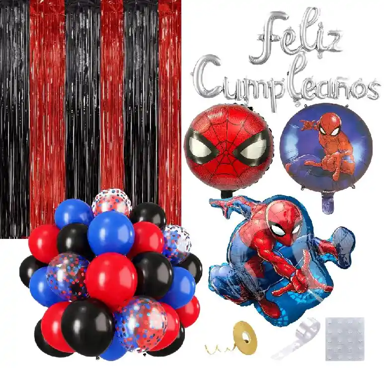 SE ENVÍA SIN INFLAR. El kit incluye 70 piezas: * 35 Globos de látex colores surtidos 10 pulgadas ( Rojo, negro y azul) * 20 Globos de látex colores surtidos 5 pulgadas ( Rojo, negro y azul) * 1 Globo de látex azul 12 pulgadas * 4 Globos de látex transparentes relleno de confeti * 1 Feliz cumpleaños inflable plateado letra cursiva * 1 Globo metalizado Spider-man * 2 Globos metalizados redondos estampado spider-man * 1 Cortina de tiras negro con rojo * 1 Cinta para arco de globos * 1 Pegante para globos * 1 Cinta dorada para globos
