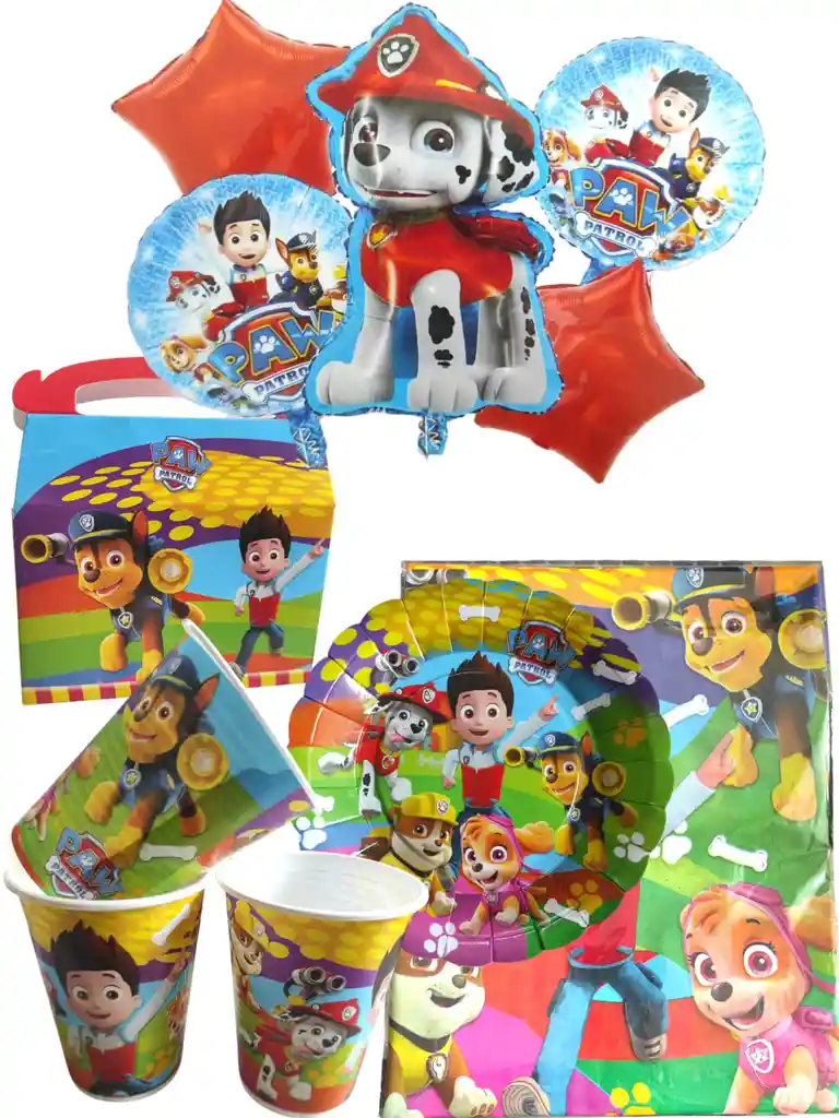 Kit de paw patrol decoracion de perritos para 12 personas 1 mantel de plastico medidas de 170 × 140 12 vasos 12 platos 6 cajas de carton para dulces piñata Listos para celebrar 5 globos metalizados de la misma tematica de 65 cm el perrito y los otros 4 de 45 cm si deseas algo adicional indicanos y con gusto te colaboramos piñateria de fiesta con joker