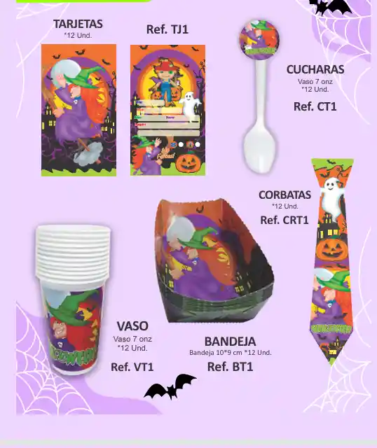 KIT FIESTERO DE HALOWEEN CONTIENE: TARJETA X 12 CUCHARA X 12 VASO *12 BANDEJA X 12 CORBATA X 12