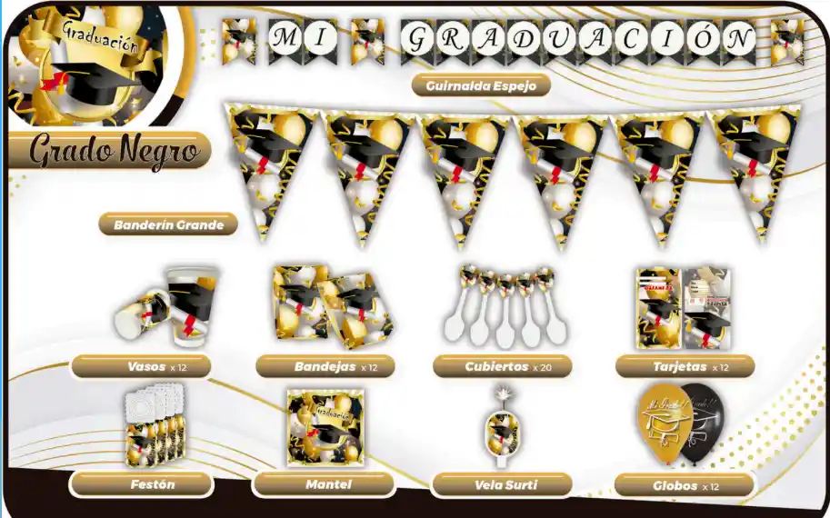 KIT FIESTERO DE MI GRADO COLOR NEGRO CONTIENE ; BANDERIN GUIRNALDA VASO X 12 BANDEJA TORTA X12 CUBIERTO X 20 TARJETA INVITACION X 12 FESTON MANTEL VELA Y BOMBAS ESTAMPADAS R12*12