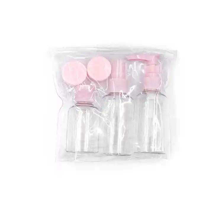 Incluye tres botellas rellenables (con dispensador, spray y tapa push) y dos mini-frascos para cremas o bálsamos. Perfecto para empacar champú, acondicionador, lociones y tónicos en el equipaje. Diseñado para un tamaño cómodo y fácil transporte en maletas o mochilas de viaje.