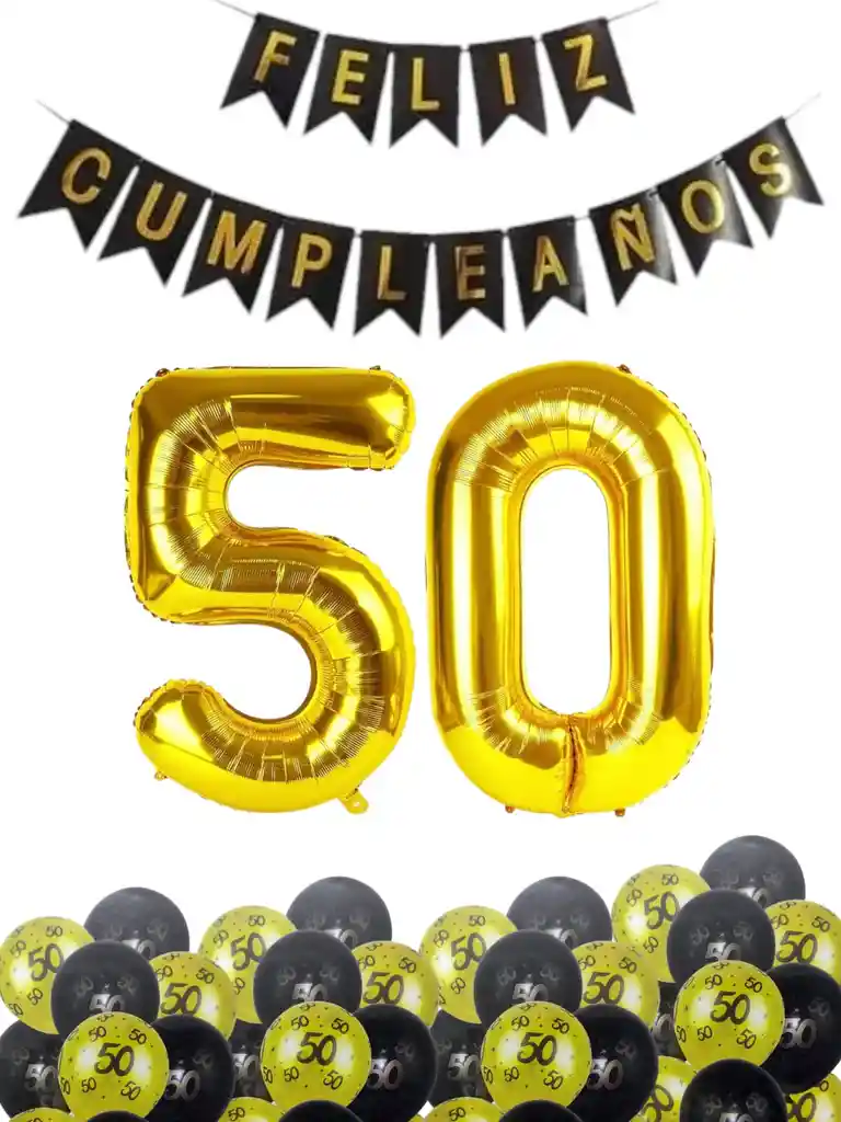 Kit Globos 50 Años Suministro Cumpleaños Fiesta Decoracion Contiene: 2 Globos #50 años metálizados dorado 80 cm 20 Globos Dorados y negros 1 Feliz cumpleaños en ESPAÑOL cadeneta Nota: globos se envian sin inflar