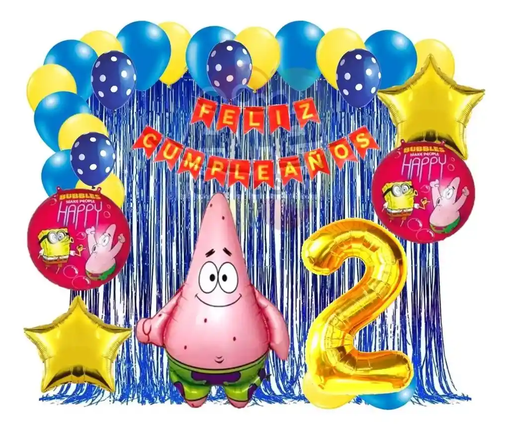 *********************GLOBOS Y PELUCHES MASMELO********************* Somos Mercado Lider Platinum Por tu compra te llevas: 3 Globo polka azul 30cm 1 Festón rojo 2 metros de largo 1 Globo Patricio 65x45cm 2 Globo Estrella dorada 45x45cm 2 cortina azul 2x1 metros 18 Globo azul 30cm 18 Globo amarillo 30cm 1 Globo número 82 cm de altura 1 Cinta de Arco 5 metros 1 Instructivo de armado de kit