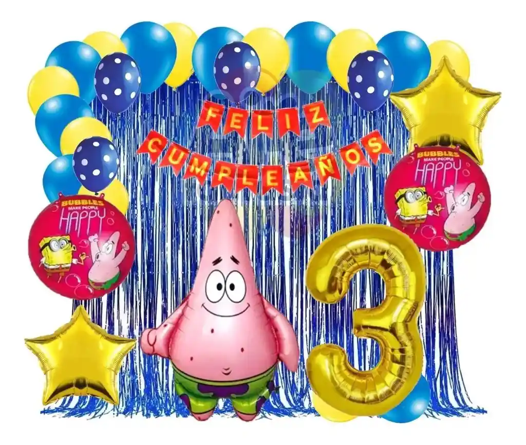 *********************GLOBOS Y PELUCHES MASMELO********************* Somos Mercado Lider Platinum Por tu compra te llevas: 3 Globo polka azul 30cm 1 Festón rojo 2 metros de largo 1 Globo Patricio 65x45cm 2 Globo Estrella dorada 45x45cm 2 cortina azul 2x1 metros 18 Globo azul 30cm 18 Globo amarillo 30cm 1 Globo número 82 cm de altura 1 Cinta de Arco 5 metros 1 Instructivo de armado de kit