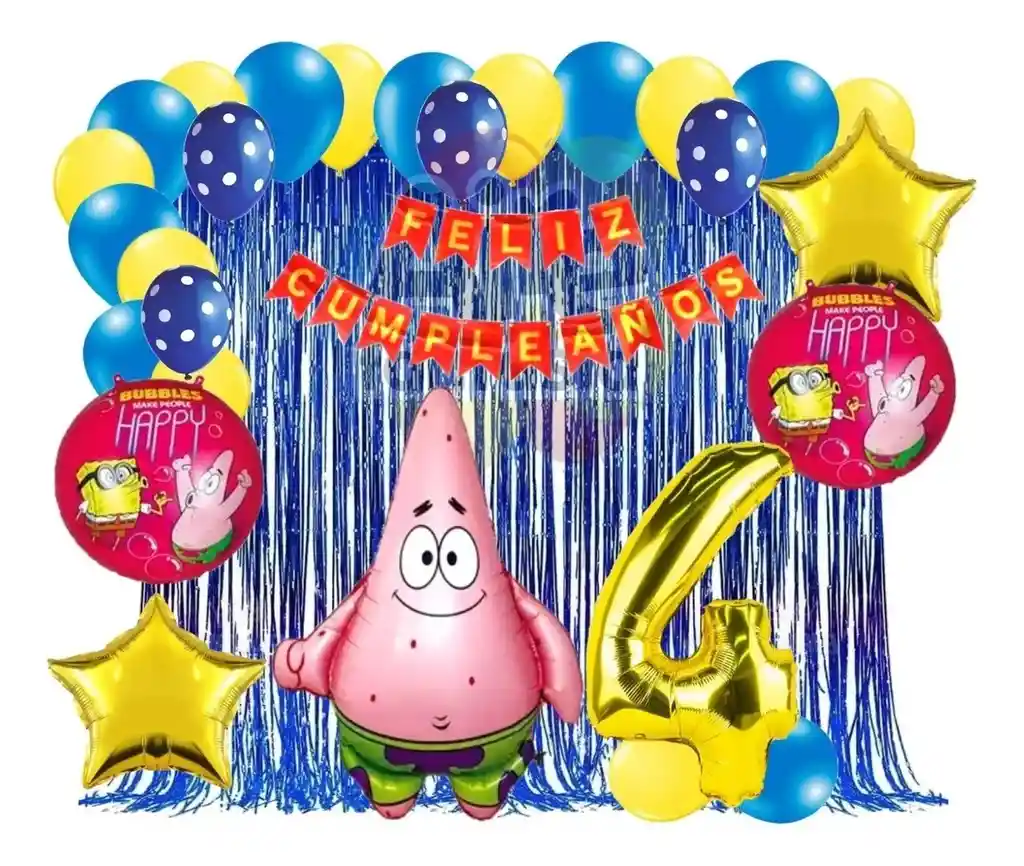 *********************GLOBOS Y PELUCHES MASMELO********************* Somos Mercado Lider Platinum Por tu compra te llevas: 3 Globo polka azul 30cm 1 Festón rojo 2 metros de largo 1 Globo Patricio 65x45cm 2 Globo Estrella dorada 45x45cm 2 cortina azul 2x1 metros 18 Globo azul 30cm 18 Globo amarillo 30cm 1 Globo número 82 cm de altura 1 Cinta de Arco 5 metros 1 Instructivo de armado de kit