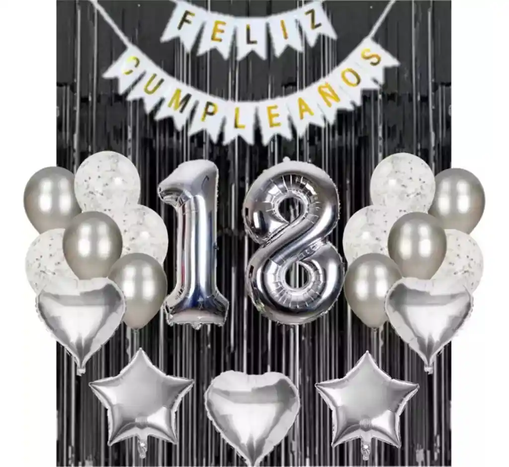 *********************GLOBOS Y PELUCHES MASMELO********************* Somos Mercado Lider Platinum Por tu compra te llevas: 1 Feston blanco 2 metros de largo 3 Globo corazón plateado 45x45cm 2 Globo estrella plateado 45x45cm 2 Globo número 82 cm altura plateado segun tu elección 2 Cortina negro 2x1 metros 6 Globo cromado plateado 30cm 6 Globo confeti transparente plateado 30cm