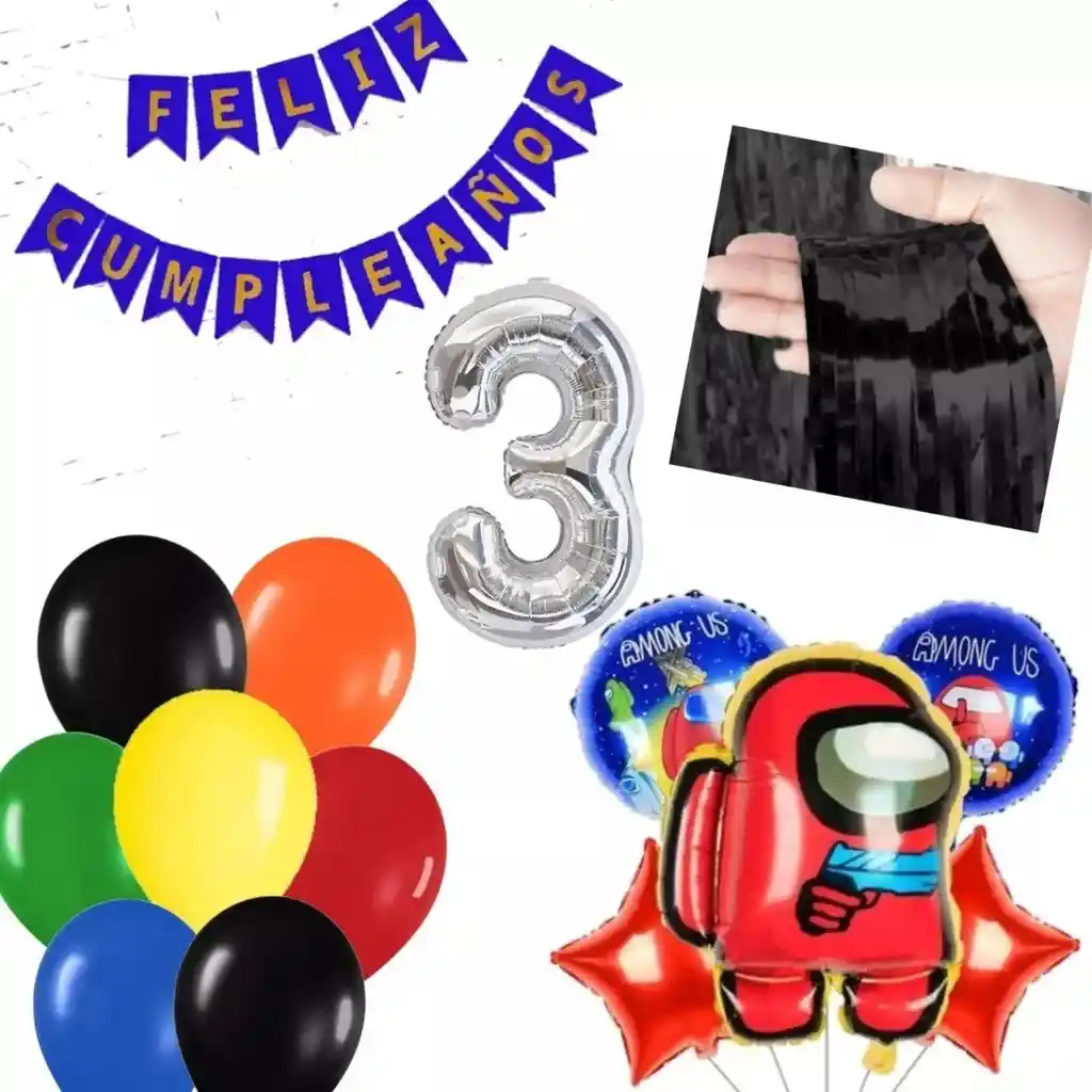 *********************GLOBOS Y PELUCHES MASMELO********************* Por tu compra te llevas. 1 Feston feliz cumpleaños azul 2 metros de largo 2 Globo circular temática Among Us 45x45cm 1 Globo plateado número 82 cm de altura 1 Globo Among Us rojo 65x45cm 2 Globo estrella rojo 45x45cm 1 Cortina negro 1×2 metros 3 Globo negro 30 cm 3 Globo azul 30cm 2 Globo naranja 30 cm 2 Globo verde 30cm 2 Globo rojo 30 cm 2 Globo amarillo 30 cm *Los globos se entregan desinflados, tu compra no incluye el montaje ni la decoración, el servicio de armado no lo tenemos disponible. sin embargo te damos todas las instrucciones para hacer de modo profesional. Si deseas adicionar otros articulos a tu compra puedes escribirnos, recuerda que Somos Globos y Peluches Masmelo Si necesitas variación en los colores, colocar un número, más globos o realizar otros cambios en el diseño original escribenos para ver si podemos hacerlo. Tenemos todo lo necesario para tus decoraciones, somos lo último en tendencias mundiales decorativas. Tenemos disponible: Vasos, platos, manteles, guirnaldas, cubiertos, globos de todo tipo, números, letreros, vela, Etc. Puedes encontrar los articulos de nuestra tienda en el siguiente link, copia y pega, si no encuentas lo que necesitas escribenos: https://www.rappi.com.co/tiendas/900280040-globosypeluchesmasmelo-mt-enc/decoracion-para-fiestas/globos-y-bombas