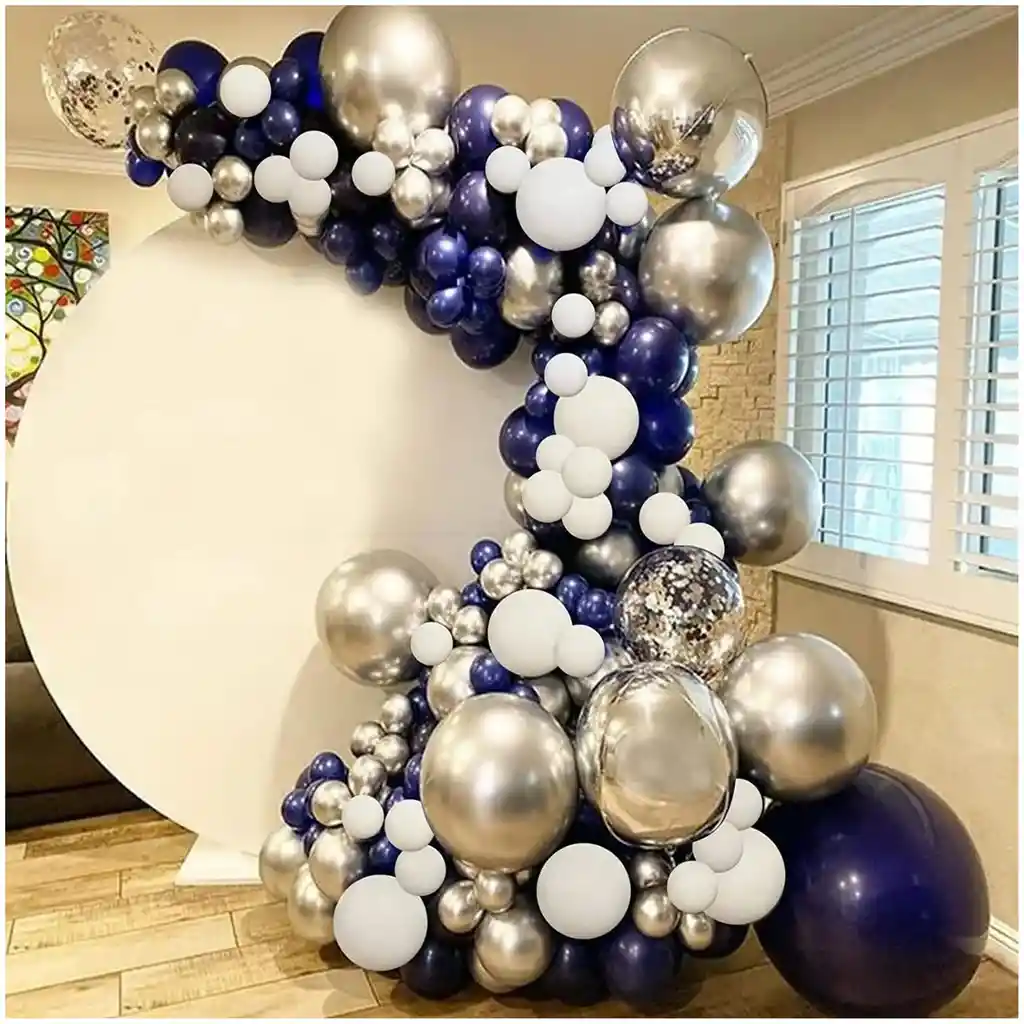 *********************GLOBOS Y PELUCHES MASMELO********************* Te damos toda la asesoria para que tú puedas armar tu propio arco Por tu compra te llevas: *No incluye fondo decorativo no está disponible. 2 Globo plateado orbit 22 pulgadas 30cm 2 Globo plateado cromado 45cm 2 Globo azul naval 30cm 10 Globo plateado cromado 30cm 30 Globo azul naval 30cm 20 Globo blanco mate 30cm 15 Globo cromado plateado 13cm 15 Globo azul naval 13cm 20 Globo blanco mate 13cm 10 Globo transparente con confetti plateado 30cm 1 Cinta de arco 5 metros 1 Pegatina 100 puntos adhesivos *No incluye fondo decorativo no está disponible. *Los globos se entregan desinflados, tu compra no incluye el montaje ni la decoración, el servicio de armado no lo tenemos disponible. sin embargo te damos todas las instrucciones para hacer de modo profesional. Si deseas adicionar otros articulos a tu compra puedes escribirnos, recuerda que Somos Globos y Peluches Masmelo ;) - En ciudades fuera de Bogotá despachamos para el mismo día si compras antes de las 11AM (no incluye festivos) - En Bogotá despachamos para el mismo día, si haces el pedido antes de las 4PM (no incluye festivos)