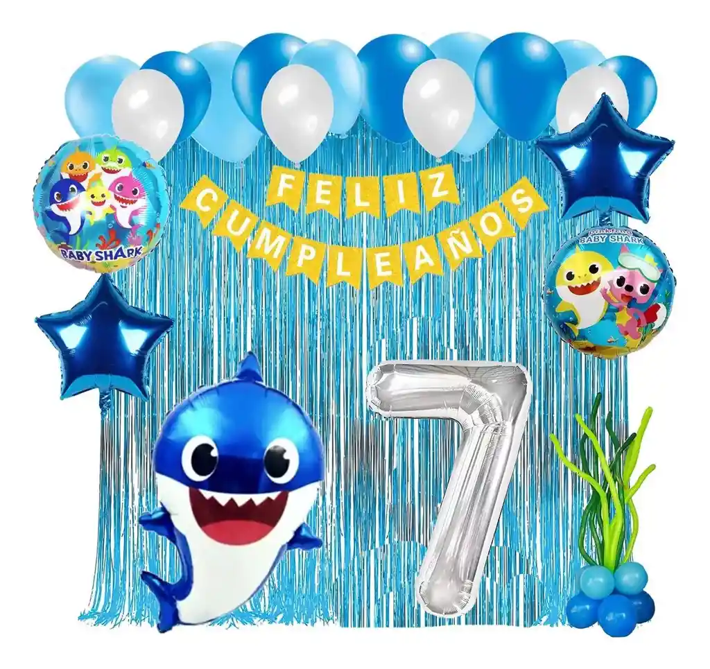 *********************GLOBOS Y PELUCHES MASMELO********************* Por tu compra te llevas. 2 Cortina azul 1×2 metros 36 Globo surtido: Blanco satin, azul claro satin, azul rey satin 30cm 2 Globo circular temática de Baby shark 45x45cm 2 Globo estrella azul rey 45x45cm 1 Globo Baby Shark azul 60×45 cm 1 Globo número plateado segun tu elección 82 cm de altura 1 guirnalda feston feliz cumpleaños 2 metros de largo 5 metros de nylon para amarrar globos *Los globos se entregan desinflados, tu compra no incluye el montaje ni la decoración, el servicio de armado no lo tenemos disponible. sin embargo te damos todas las instrucciones para hacer de modo profesional. Si deseas adicionar otros articulos a tu compra puedes escribirnos, recuerda que Somos Globos y Peluches Masmelo Si necesitas variación en los colores, colocar un número, más globos o realizar otros cambios en el diseño original escribenos para ver si podemos hacerlo. Tenemos todo lo necesario para tus decoraciones, somos lo último en tendencias mundiales decorativas. Tenemos disponible: Vasos, platos, manteles, guirnaldas, cubiertos, globos de todo tipo, números, letreros, vela, Etc. Puedes encontrar los articulos de nuestra tienda en el siguiente link, copia y pega, si no encuentas lo que necesitas escribenos: https://www.rappi.com.co/tiendas/900280040-globosypeluchesmasmelo-mt-enc/decoracion-para-fiestas/globos-y-bombas