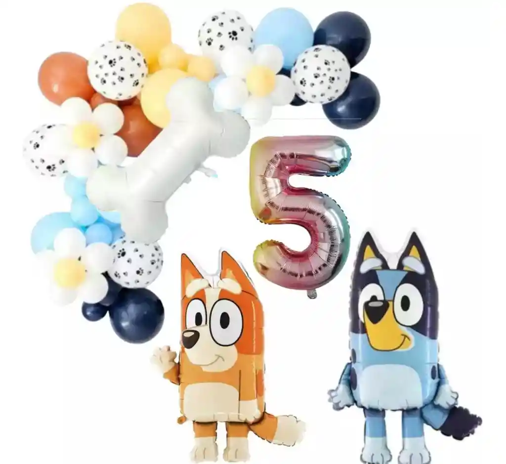 *********************GLOBOS Y PELUCHES MASMELO********************* Somos Mercado Lider Platinum Por tu compra te llevas: 1 Globo Hueso 60x40cm 1 Globo Bingo 65x45cm 1 Globo Bluey 65x45cm 5 Globo huellas de perro 30cm 1 Globo número tornasol de 82 cm según tu elección 20 Globo blanco 13cm 10 Globo azul pastel 30cm 5 Globo azul pastel 13cm 10 Globo crema 30 cm 10 Globo amarillo pastel 30cm 10 Globo amarillo pastel 13cm 8 Globo azul naval 30cm 4 Globo azul naval 13cm 1 Cinta de arco 5 metros 1 Cinta de 100 puntos adhesivos
