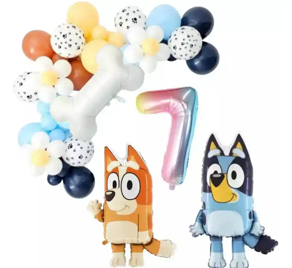 *********************GLOBOS Y PELUCHES MASMELO********************* Somos Mercado Lider Platinum Por tu compra te llevas: 1 Globo Hueso 60x40cm 1 Globo Bingo 65x45cm 1 Globo Bluey 65x45cm 5 Globo huellas de perro 30cm 1 Globo número tornasol de 82 cm según tu elección 20 Globo blanco 13cm 10 Globo azul pastel 30cm 5 Globo azul pastel 13cm 10 Globo crema 30 cm 10 Globo amarillo pastel 30cm 10 Globo amarillo pastel 13cm 8 Globo azul naval 30cm 4 Globo azul naval 13cm 1 Cinta de arco 5 metros 1 Cinta de 100 puntos adhesivos