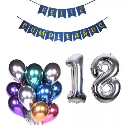 *********************GLOBOS Y PELUCHES MASMELO********************* Por tu compra te llevas. 1 Feston feliz cumpleaños negro 2 metros 12 Globo cromado colores surtido 30 cm ( si necesitas un color en especifico puedes escribir al hacer la compra) 2 Globo número plateado 82 cm *Los globos se entregan desinflados, tu compra no incluye el montaje ni la decoración, el servicio de armado no lo tenemos disponible. sin embargo te damos todas las instrucciones para hacer de modo profesional. Si deseas adicionar otros articulos a tu compra puedes escribirnos, recuerda que Somos Globos y Peluches Masmelo Si necesitas variación en los colores, colocar un número, más globos o realizar otros cambios en el diseño original escribenos para ver si podemos hacerlo. Tenemos todo lo necesario para tus decoraciones, somos lo último en tendencias mundiales decorativas. Tenemos disponible: Vasos, platos, manteles, guirnaldas, cubiertos, globos de todo tipo, números, letreros, vela, Etc. Puedes encontrar los articulos de nuestra tienda en el siguiente link, copia y pega, si no encuentas lo que necesitas escribenos: https://www.rappi.com.co/tiendas/900280040-globosypeluchesmasmelo-mt-enc/decoracion-para-fiestas/globos-y-bombas