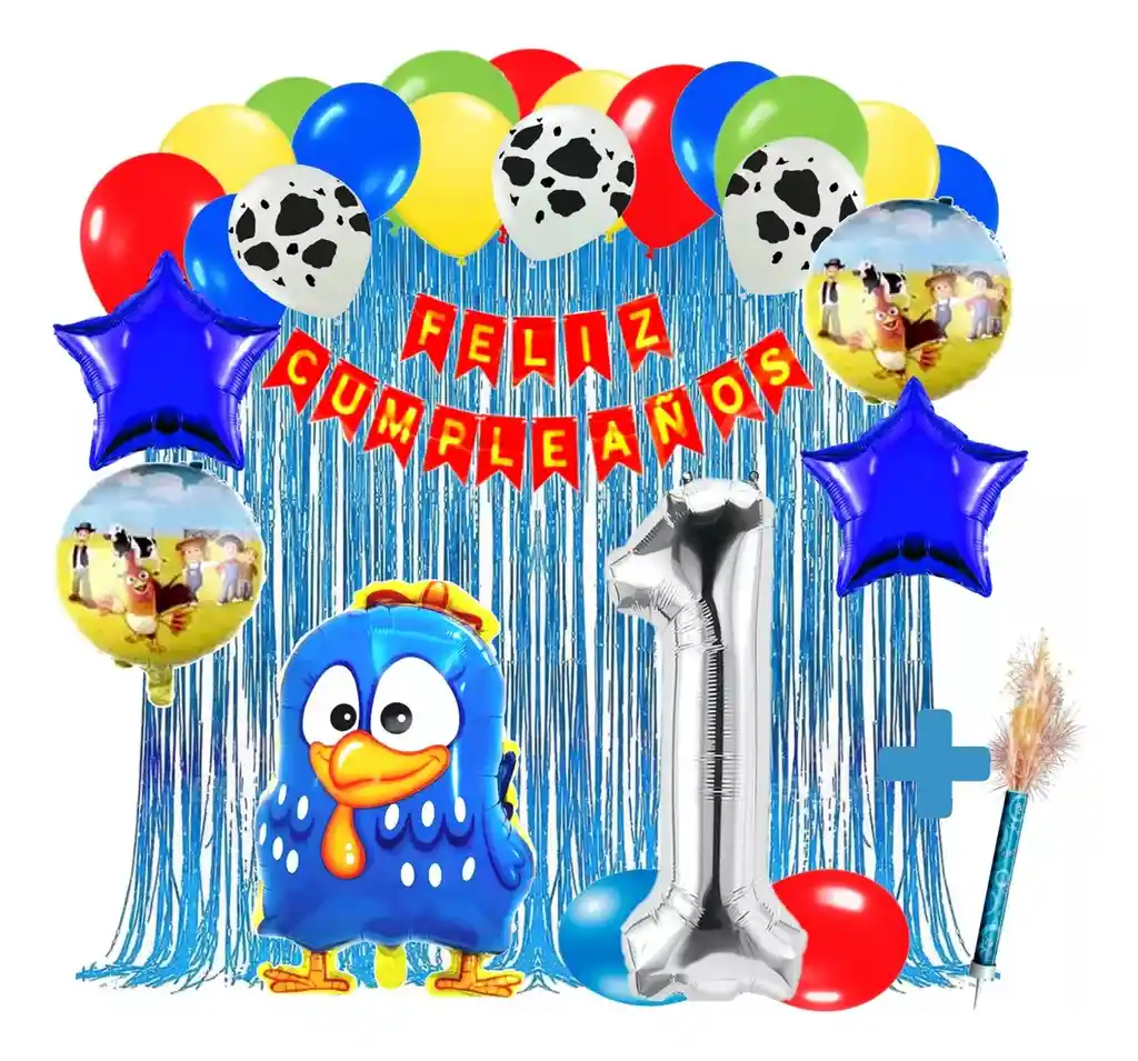 *********************GLOBOS Y PELUCHES MASMELO********************* Somos Mercado Lider Platinum Por tu compra te llevas: 1 Globo Gallina Pintadita 65x45cm 1 Feston rojo 2 metros 2 Globo circular temática gallinita pintadita 45x45cm 2 Globo estrella azul 45x45cm 2 Cortina azul celeste 2x1 metro 1 Vela Volcan 3 Globo mancas de vaca 30cm 10 Globo rojo 30 cm 10 Globo Azul 30cm 10 Globo verde 30cm 10 Globo amarillo 30cm 1 Globo numero plateado 82 cm segun tu elección 1 Cinta de Arco 5 metros