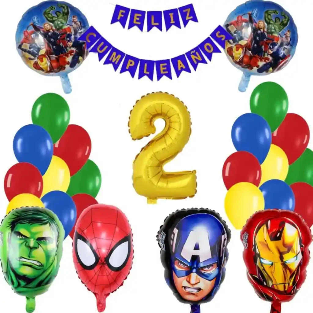*********************GLOBOS Y PELUCHES MASMELO********************* Somos Mercado Lider Platinum Por tu compra te llevas: 1 Globo feston azul 2 metros de largo 2 Globo circular temática heroes 45x45cm 1 Globo número dorado 82 cm de altura según tu elección 6 Globo verde 30cm 6 Globo rojo 30 cm 6 Globo azul 30cm 6 Globo verde 30cm 1 Globo cabeza de hulk 45x30cm 1 Globo cabeza de spiderman 45x30cm 1 Globo cabeza capitan america 45x30cm 1 Globo cabeza de Iron Man 45x30cm