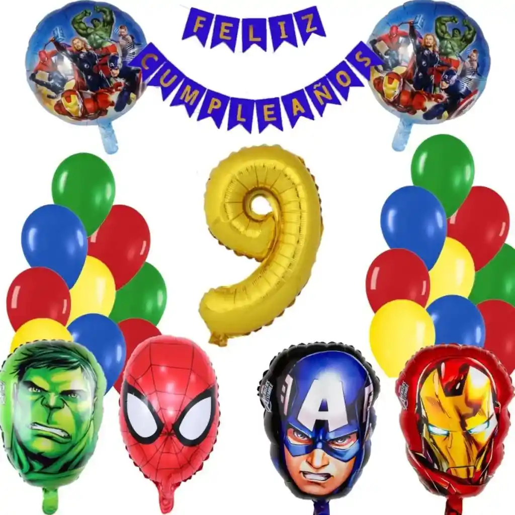 *********************GLOBOS Y PELUCHES MASMELO********************* Somos Mercado Lider Platinum Por tu compra te llevas: 1 Globo feston azul 2 metros de largo 2 Globo circular temática heroes 45x45cm 1 Globo número dorado 82 cm de altura según tu elección 6 Globo verde 30cm 6 Globo rojo 30 cm 6 Globo azul 30cm 6 Globo verde 30cm 1 Globo cabeza de hulk 45x30cm 1 Globo cabeza de spiderman 45x30cm 1 Globo cabeza capitan america 45x30cm 1 Globo cabeza de Iron Man 45x30cm