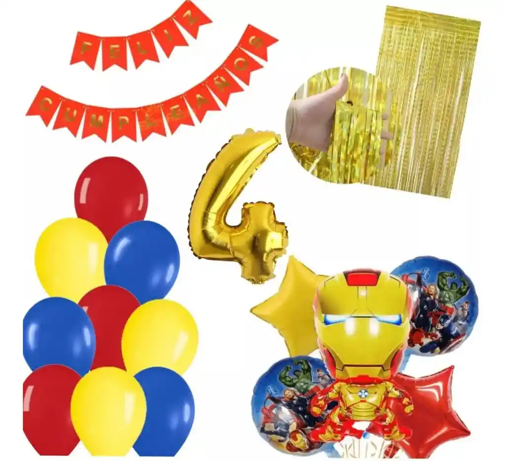 *********************GLOBOS Y PELUCHES MASMELO********************* Somos Mercado Lider Platinum Por tu compra te llevas. 2 Globo circular temática Iron Man 45x45cm 2 Globo estrella dorado y rojo 45x45cm 1 Globo de Iron man 65x45cm 1 cortina flecos 1*2 metros dorado1 Globo número dorado 82 cm 3 Globo rojo 30 cm 3 Globo amarillo 30 cm 4 Globo azul 30 cm 1 Feston feliz cumpleaños 2 metros de largo *Los globos se entregan desinflados, tu compra no incluye el montaje ni la decoración, el servicio de armado no lo tenemos disponible. sin embargo te damos todas las instrucciones para hacer de modo profesional. Si deseas adicionar otros articulos a tu compra puedes escribirnos, recuerda que Somos Globos y Peluches Masmelo Si necesitas variación en los colores, colocar un número, más globos o realizar otros cambios en el diseño original escribenos para ver si podemos hacerlo. Tenemos todo lo necesario para tus decoraciones, somos lo último en tendencias mundiales decorativas. Tenemos disponible: Vasos, platos, manteles, guirnaldas, cubiertos, globos de todo tipo, números, letreros, vela, Etc. Puedes encontrar los articulos de nuestra tienda en el siguiente link, copia y pega, si no encuentas lo que necesitas escribenos:
