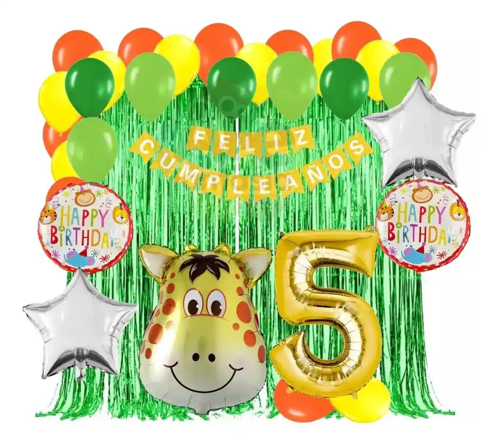 *********************GLOBOS Y PELUCHES MASMELO********************* Somos Mercado Lider Platinum Por tu compra te llevas: 36 Globo surtido: naranja, verde lima, verde selva, amarillo 30cm 1 Globo cabeza de jirafa grande 55x45cm 1 Globo número segun tu elección 82 cm dorado 2 Globo estrella 45x45cm plateada 2 Globo circular tematica cumpleaños 45x45cm 1 Guirnalda decorativa feliz cumpleaños 2 metros de largo dorada 2 Cortina flecos decorativa 2X1 m 5 Cinta de arco 5 metros *Los globos se entregan desinflados, tu compra no incluye el montaje ni la decoración, el servicio de armado no lo tenemos disponible. sin embargo te damos todas las instrucciones para hacer de modo profesional. Si deseas adicionar otros articulos a tu compra puedes escribirnos, recuerda que Somos Globos y Peluches Masmelo Si necesitas variación en los colores, colocar un número, más globos o realizar otros cambios en el diseño original escribenos para ver si podemos hacerlo. Tenemos todo lo necesario para tus decoraciones, somos lo último en tendencias mundiales decorativas. Tenemos disponible: Vasos, platos, manteles, guirnaldas, cubiertos, globos de todo tipo, números, letreros, vela, Etc. Puedes encontrar los articulos de nuestra tienda en el siguiente link, copia y pega, si no encuentas lo que necesitas escribenos: