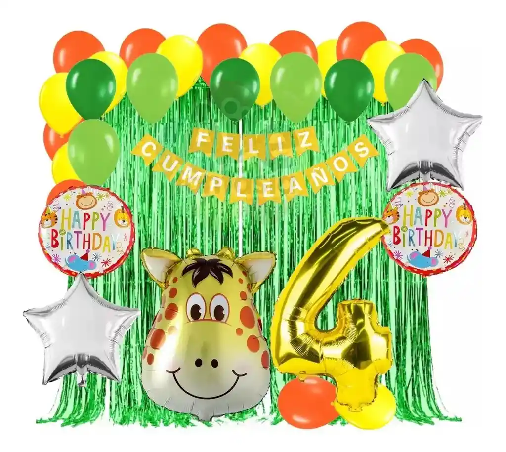 *********************GLOBOS Y PELUCHES MASMELO********************* Somos Mercado Lider Platinum Por tu compra te llevas: 36 Globo surtido: naranja, verde lima, verde selva, amarillo 30cm 1 Globo cabeza de jirafa grande 55x45cm 1 Globo número segun tu elección 82 cm dorado 2 Globo estrella 45x45cm plateada 2 Globo circular tematica cumpleaños 45x45cm 1 Guirnalda decorativa feliz cumpleaños 2 metros de largo dorada 2 Cortina flecos decorativa 2X1 m 5 Cinta de arco 5 metros *Los globos se entregan desinflados, tu compra no incluye el montaje ni la decoración, el servicio de armado no lo tenemos disponible. sin embargo te damos todas las instrucciones para hacer de modo profesional. Si deseas adicionar otros articulos a tu compra puedes escribirnos, recuerda que Somos Globos y Peluches Masmelo Si necesitas variación en los colores, colocar un número, más globos o realizar otros cambios en el diseño original escribenos para ver si podemos hacerlo. Tenemos todo lo necesario para tus decoraciones, somos lo último en tendencias mundiales decorativas. Tenemos disponible: Vasos, platos, manteles, guirnaldas, cubiertos, globos de todo tipo, números, letreros, vela, Etc. Puedes encontrar los articulos de nuestra tienda en el siguiente link, copia y pega, si no encuentas lo que necesitas escribenos: