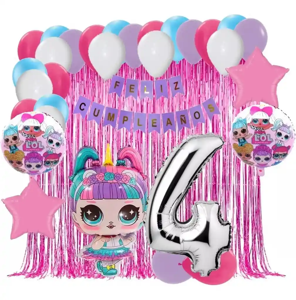 *********************GLOBOS Y PELUCHES MASMELO********************* Por tu compra te llevas. 2 Cortina rojo 1×2 metros 36 Globo surtido: blanco, fucsia, morado, azul celeste 30cm 2 Globo circular temática LOL 45x45cm 1 Globo LOL unicornio 60×45 cm 2 Globo estrella rosado 45x45cm 1 Globo número plateado segun tu elección 82 cm de altura 1 guirnalda feston feliz cumpleaños 2 metros de largo 5 metros de nylon para amarrar globos *Los globos se entregan desinflados, tu compra no incluye el montaje ni la decoración, el servicio de armado no lo tenemos disponible. sin embargo te damos todas las instrucciones para hacer de modo profesional. Si deseas adicionar otros articulos a tu compra puedes escribirnos, recuerda que Somos Globos y Peluches Masmelo Si necesitas variación en los colores, colocar un número, más globos o realizar otros cambios en el diseño original escribenos para ver si podemos hacerlo. Tenemos todo lo necesario para tus decoraciones, somos lo último en tendencias mundiales decorativas. Tenemos disponible: Vasos, platos, manteles, guirnaldas, cubiertos, globos de todo tipo, números, letreros, vela, Etc. Puedes encontrar los articulos de nuestra tienda en el siguiente link, copia y pega, si no encuentas lo que necesitas escribenos: https://www.rappi.com.co/tiendas/900280040-globosypeluchesmasmelo-mt-enc/decoracion-para-fiestas/globos-y-bombas