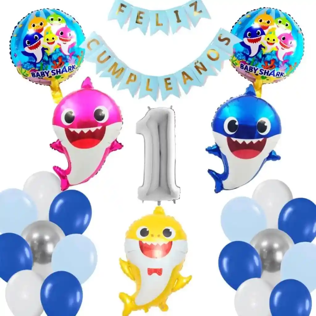 *********************GLOBOS Y PELUCHES MASMELO********************* Somos Mercado Lider Platinum Por tu compra te llevas: 1 Globo Mommy Shark rosado 65x45cm 1 Globo Baby shark amarillo 65x45cm 1 Globo Daddy shark azul 65x45cm 1 feston azul claro 2 metro de largo 6 Globo azul pastel 30cm 6 Globo azul rey 30cm 4 Globo plateado cromado 30cm 6 Globo blanco 30cm 1 Globo número 82 cm de altura plateado segun tu elección 2 Globo circular temática de baby shark 45x45cm