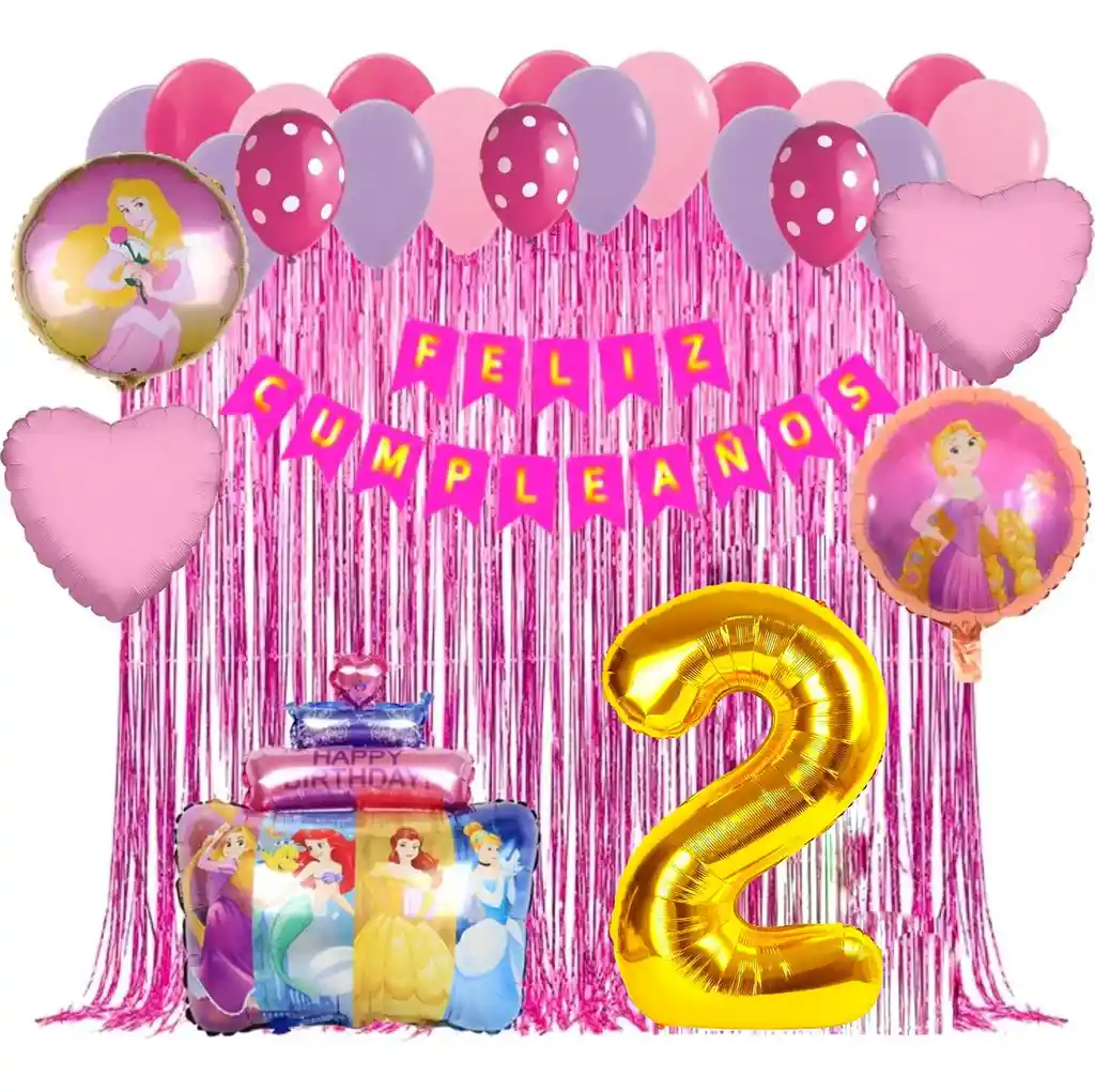 *********************GLOBOS Y PELUCHES MASMELO********************* Somos Mercado Lider Platinum Por tu compra te llevas: 1 Globo Pastel princesas 65x45cm 2 Cortina flecos fucsia 2x1 metros 1 Feston cumpleaños fucsia 2 metros 3 Globo polka 30cm 2 Globo corazón rosado 45x45cm 1 Globo número dorado 82 cm altura 12 Globo morado pastel 30cm 12 Globo rosado pastel 30cm 12 Globo fucsia 30cm 2 Globo circulo temática princesas 45x45cm 1 Cinta de Arco 5 metros 1 Instructivo de armado de kit