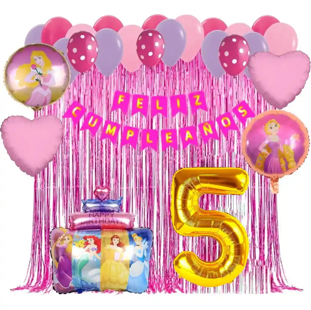 *********************GLOBOS Y PELUCHES MASMELO********************* Somos Mercado Lider Platinum Por tu compra te llevas: 1 Globo Pastel princesas 65x45cm 2 Cortina flecos fucsia 2x1 metros 1 Feston cumpleaños fucsia 2 metros 3 Globo polka 30cm 2 Globo corazón rosado 45x45cm 1 Globo número dorado 82 cm altura 12 Globo morado pastel 30cm 12 Globo rosado pastel 30cm 12 Globo fucsia 30cm 2 Globo circulo temática princesas 45x45cm 1 Cinta de Arco 5 metros 1 Instructivo de armado de kit