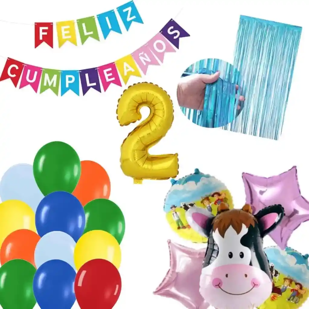 *********************GLOBOS Y PELUCHES MASMELO********************* Por tu compra te llevas. 1 Cortina flecos azul 1×2 metros 1 Globo número dorado 82 cm 1 Globo feston feliz cumpleaños 2 metros de largo 3 Globo verde 30 cm 3 Globo azul rey 30 cm 3 Globo amarillo 30 cm 3 Globo rojo 30 cm 3 Globo azul pastel 30 cm 3 Globo naranja 30 cm 2 Globo circular temática granja 45x45cm 2 Globo estrella oro rosa 45x45cm 1 Globo vaca 55x40cm *Los globos se entregan desinflados, tu compra no incluye el montaje ni la decoración, el servicio de armado no lo tenemos disponible. sin embargo te damos todas las instrucciones para hacer de modo profesional. Si deseas adicionar otros articulos a tu compra puedes escribirnos, recuerda que Somos Globos y Peluches Masmelo Si necesitas variación en los colores, colocar un número, más globos o realizar otros cambios en el diseño original escribenos para ver si podemos hacerlo. Tenemos todo lo necesario para tus decoraciones, somos lo último en tendencias mundiales decorativas. Tenemos disponible: Vasos, platos, manteles, guirnaldas, cubiertos, globos de todo tipo, números, letreros, vela, Etc. Puedes encontrar los articulos de nuestra tienda en el siguiente link, copia y pega, si no encuentas lo que necesitas escribenos: https://www.rappi.com.co/tiendas/900280040-globosypeluchesmasmelo-mt-enc/decoracion-para-fiestas/globos-y-bombas