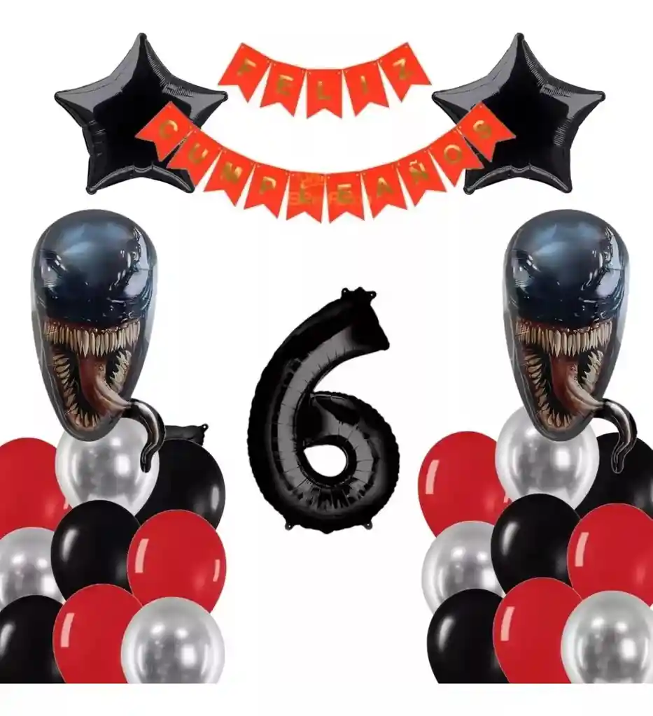 *********************GLOBOS Y PELUCHES MASMELO********************* Por tu compra te llevas. 2 Globo negro estrella 45x45cm 2 Globo feston feliz cumpleaños rojo 2 metros 1 Globo número negro 82 cm de altura 2 Globo cabeza de Venom 45x45cm 6 Globo rojo 30 cm 8 Globo negro 30 cm 6 Globo plateado cromado 30 cm *Los globos se entregan desinflados, tu compra no incluye el montaje ni la decoración, el servicio de armado no lo tenemos disponible. sin embargo te damos todas las instrucciones para hacer de modo profesional. Si deseas adicionar otros articulos a tu compra puedes escribirnos, recuerda que Somos Globos y Peluches Masmelo Si necesitas variación en los colores, colocar un número, más globos o realizar otros cambios en el diseño original escribenos para ver si podemos hacerlo. Tenemos todo lo necesario para tus decoraciones, somos lo último en tendencias mundiales decorativas. Tenemos disponible: Vasos, platos, manteles, guirnaldas, cubiertos, globos de todo tipo, números, letreros, vela, Etc. Puedes encontrar los articulos de nuestra tienda en el siguiente link, copia y pega, si no encuentas lo que necesitas escribenos: https://www.rappi.com.co/tiendas/900280040-globosypeluchesmasmelo-mt-enc/decoracion-para-fiestas/globos-y-bombas