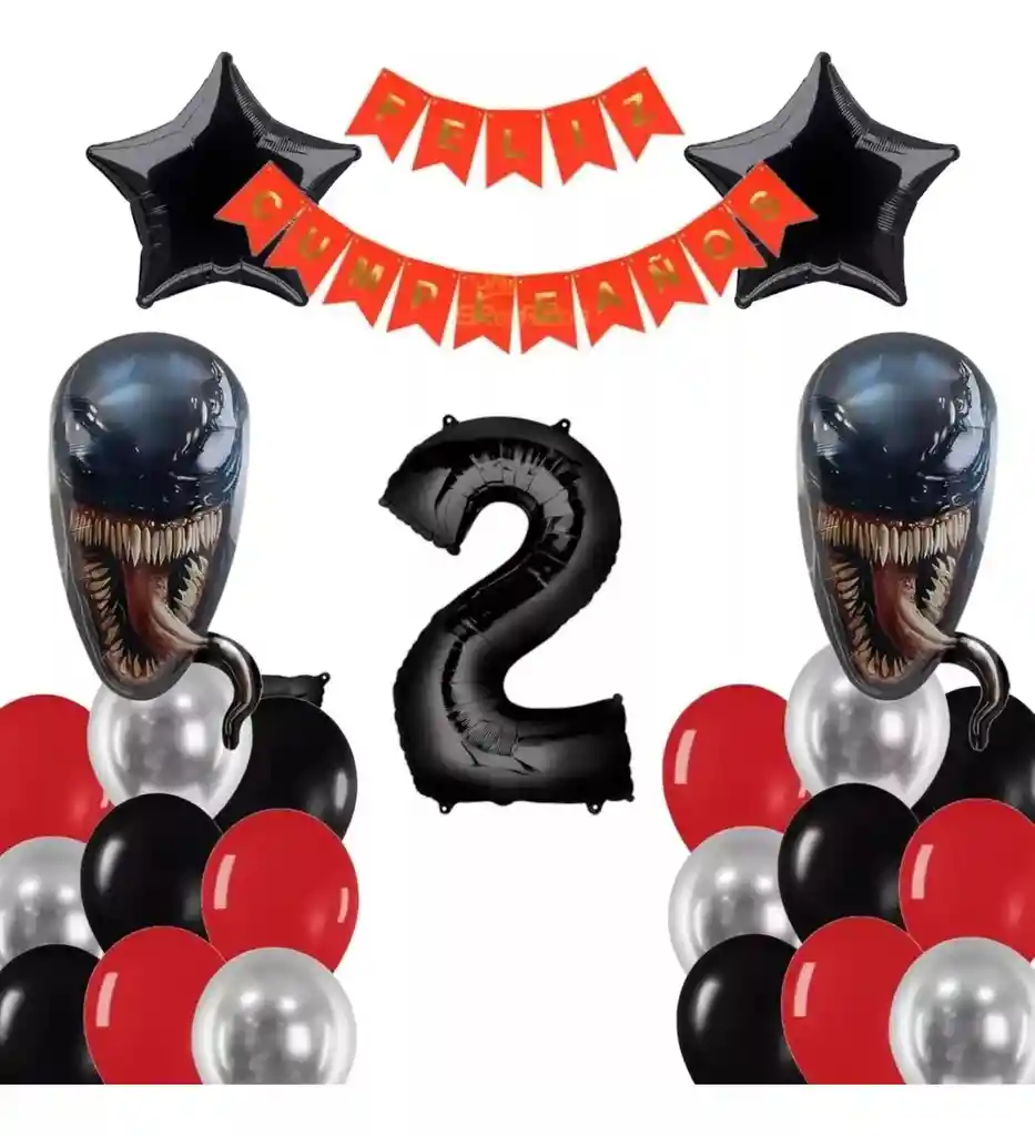 *********************GLOBOS Y PELUCHES MASMELO********************* Por tu compra te llevas. 2 Globo negro estrella 45x45cm 2 Globo feston feliz cumpleaños rojo 2 metros 1 Globo número negro 82 cm de altura 2 Globo cabeza de Venom 45x45cm 6 Globo rojo 30 cm 8 Globo negro 30 cm 6 Globo plateado cromado 30 cm *Los globos se entregan desinflados, tu compra no incluye el montaje ni la decoración, el servicio de armado no lo tenemos disponible. sin embargo te damos todas las instrucciones para hacer de modo profesional. Si deseas adicionar otros articulos a tu compra puedes escribirnos, recuerda que Somos Globos y Peluches Masmelo Si necesitas variación en los colores, colocar un número, más globos o realizar otros cambios en el diseño original escribenos para ver si podemos hacerlo. Tenemos todo lo necesario para tus decoraciones, somos lo último en tendencias mundiales decorativas. Tenemos disponible: Vasos, platos, manteles, guirnaldas, cubiertos, globos de todo tipo, números, letreros, vela, Etc. Puedes encontrar los articulos de nuestra tienda en el siguiente link, copia y pega, si no encuentas lo que necesitas escribenos: https://www.rappi.com.co/tiendas/900280040-globosypeluchesmasmelo-mt-enc/decoracion-para-fiestas/globos-y-bombas