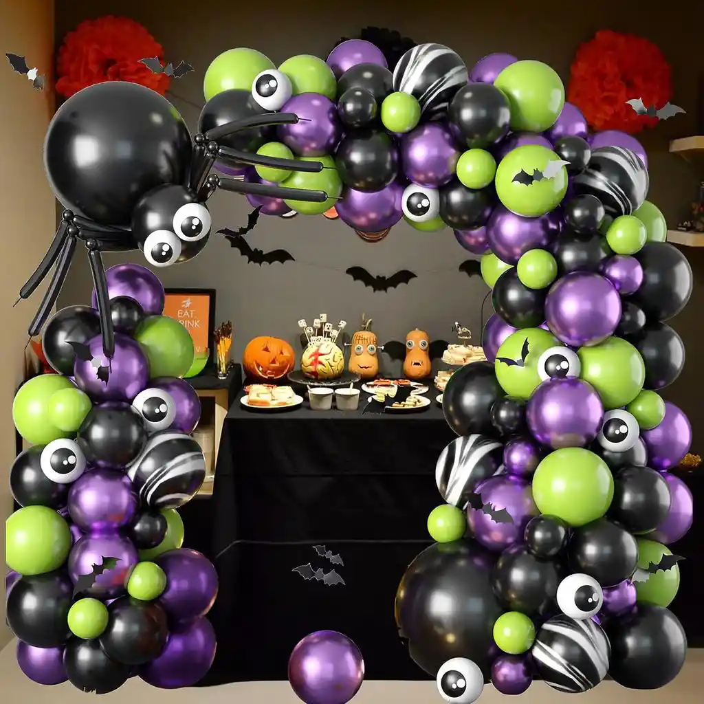*********************GLOBOS Y PELUCHES MASMELO********************* ————————–Somos Mercado Líder Platinum———————— Te damos toda la asesoría para que tú puedas armar tu propio arco Por tu compra te llevas: 2 Globo negro 45 cm 10 Globo blanco 30 cm (para hacer los ojos) 5 Globo ágata negro 30 cm 25 Globo morado cromado 30 cm 15 Globo morado cromado 13 cm 25 Globo verde lima 30 cm 15 Globo verde lima 13 cm 25 Globo negro 30 cm 15 Globo negro 13 cm Accesorios: -Punto de pegamento: 1 rollo -Cinta de cadena: 1 rollo *Los globos se entregan desinflados, tu compra no incluye el montaje ni la decoración, el servicio de armado no lo tenemos disponible. sin embargo te damos todas las instrucciones para hacer de modo profesional. Si deseas adicionar otros artículos a tu compra puedes escribirnos, recuerda que Somos Globos y Peluches Masmelo Si necesitas variación en los colores, colocar un número, más globos o realizar otros cambios en el diseño original escríbenos para ver si podemos hacerlo. Tenemos todo lo necesario para tus decoraciones, somos lo último en tendencias mundiales decorativas. Tenemos disponible: Vasos, platos, manteles, guirnaldas, cubiertos, globos de todo tipo, números, letreros, vela, Etc. Puedes encontrar los artículos de nuestra tienda en el siguiente link, copia y pega, si no encuentras lo que necesitas escríbenos: https://www.rappi.com.co/tiendas/900280040-globosypeluchesmasmelo-mt-enc/decoracion-para-fiestas/globos-y-bombas