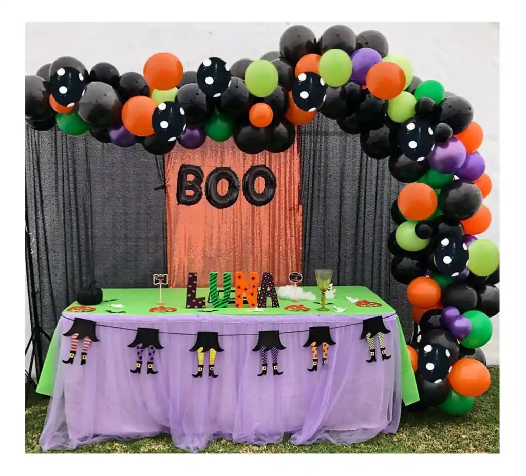 *********************GLOBOS Y PELUCHES MASMELO********************* ————————–Somos Mercado Líder Platinum———————— Te damos toda la asesoría para que tú puedas armar tu propio arco Por tu compra te llevas: 35 Globo negro 30 cm 15 Globo negro 13 cm 10 Globo verde fashion 30 cm 10 Globo verde fashion 13 cm 10 Globo morado cromado 13 cm 10 Globo morado cromado 13 cm 8 Globo negro polka 30 cm 15 Globo naranja 30 cm 10 Globo naranja 13 cm 15 Globo verde lima 30 cm Accesorios: -Punto de pegamento: 1 rollo -Cinta de cadena: 1 rollo *Los globos se entregan desinflados, tu compra no incluye el montaje ni la decoración, el servicio de armado no lo tenemos disponible. sin embargo te damos todas las instrucciones para hacer de modo profesional. Si deseas adicionar otros artículos a tu compra puedes escribirnos, recuerda que Somos Globos y Peluches Masmelo Si necesitas variación en los colores, colocar un número, más globos o realizar otros cambios en el diseño original escríbenos para ver si podemos hacerlo. Tenemos todo lo necesario para tus decoraciones, somos lo último en tendencias mundiales decorativas. Tenemos disponible: Vasos, platos, manteles, guirnaldas, cubiertos, globos de todo tipo, números, letreros, vela, Etc. Puedes encontrar los artículos de nuestra tienda en el siguiente link, copia y pega, si no encuentras lo que necesitas escríbenos: https://www.rappi.com.co/tiendas/900280040-globosypeluchesmasmelo-mt-enc/decoracion-para-fiestas/globos-y-bombas