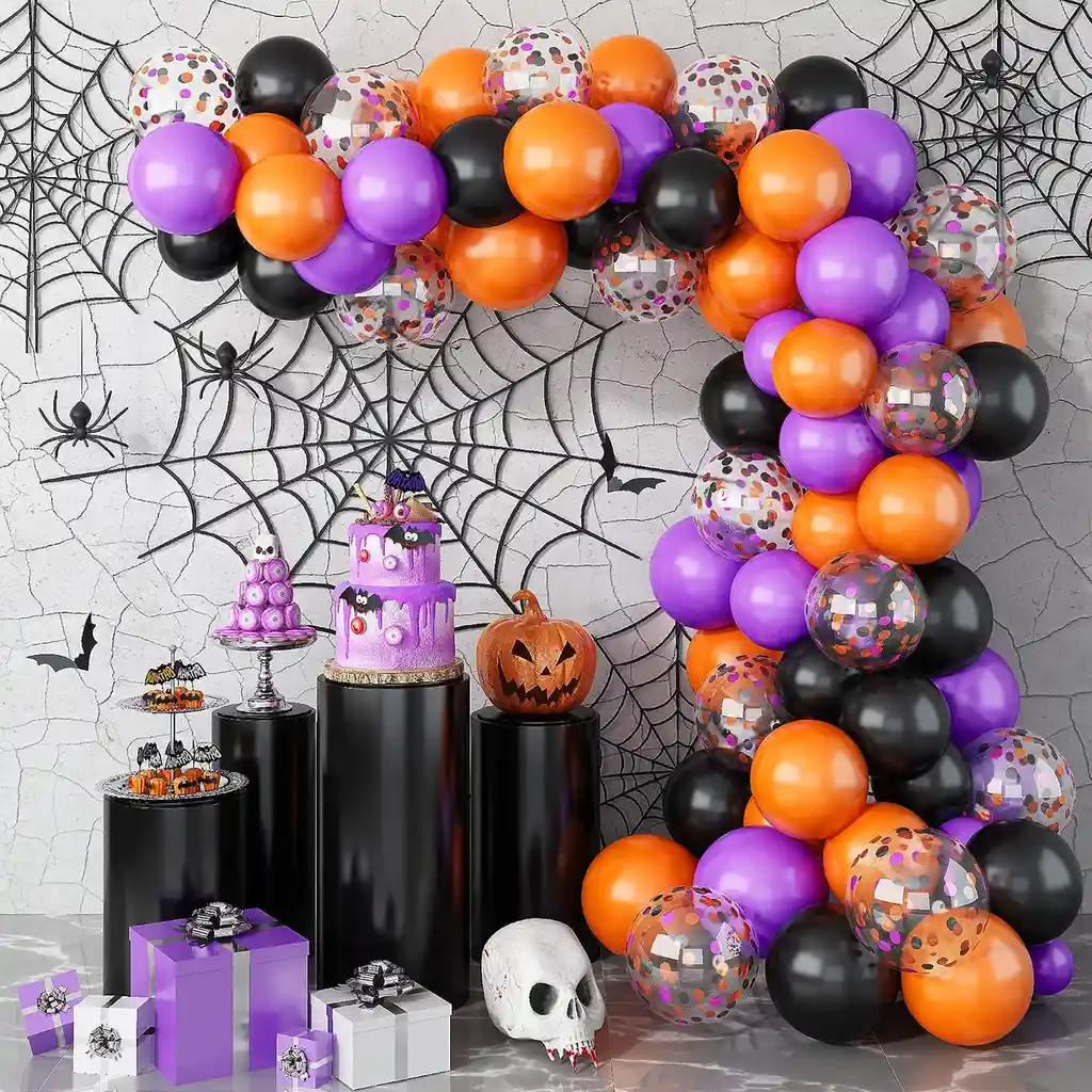 *********************GLOBOS Y PELUCHES MASMELO********************* ————————–Somos Mercado Líder Platinum———————— Te damos toda la asesoría para que tú puedas armar tu propio arco Por tu compra te llevas: 15 Globo transparente con confeti 30 cm 30 Globo naranja 30 cm 30 Globo negro 30 cm 30 Globo morado 30 cm Accesorios: -Punto de pegamento: 1 rollo -Cinta de cadena: 1 rollo *Los globos se entregan desinflados, tu compra no incluye el montaje ni la decoración, el servicio de armado no lo tenemos disponible. sin embargo te damos todas las instrucciones para hacer de modo profesional. Si deseas adicionar otros artículos a tu compra puedes escribirnos, recuerda que Somos Globos y Peluches Masmelo Si necesitas variación en los colores, colocar un número, más globos o realizar otros cambios en el diseño original escríbenos para ver si podemos hacerlo. Tenemos todo lo necesario para tus decoraciones, somos lo último en tendencias mundiales decorativas. Tenemos disponible: Vasos, platos, manteles, guirnaldas, cubiertos, globos de todo tipo, números, letreros, vela, Etc. Puedes encontrar los artículos de nuestra tienda en el siguiente link, copia y pega, si no encuentras lo que necesitas escríbenos: https://www.rappi.com.co/tiendas/900280040-globosypeluchesmasmelo-mt-enc/decoracion-para-fiestas/globos-y-bombas