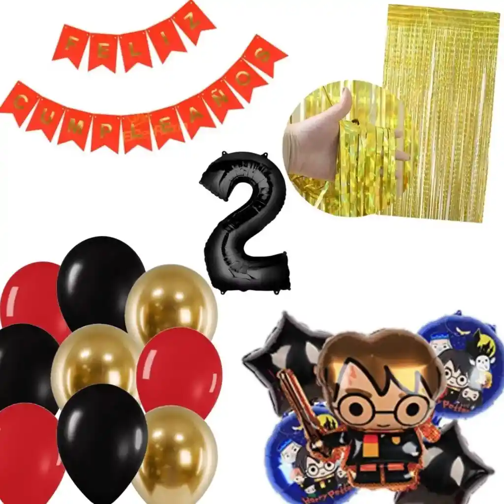 *********************GLOBOS Y PELUCHES MASMELO********************* Por tu compra te llevas. 1 Feston feliz cumpleaños 2 metros de largo 1 Cortina flecos dorado 1×2 metros 1 Globo número negro 82cm 2 Globo temática Harry Potter 45x45cm 2 Globo estrella negro 45x45cm 1 Globo Harry Potter 65x45cm 3 Globo cromado dorado 30 cm 4 Globo negro 30 cm 3 Globo rojo 30 cm *Los globos se entregan desinflados, tu compra no incluye el montaje ni la decoración, el servicio de armado no lo tenemos disponible. sin embargo te damos todas las instrucciones para hacer de modo profesional. Si deseas adicionar otros articulos a tu compra puedes escribirnos, recuerda que Somos Globos y Peluches Masmelo Si necesitas variación en los colores, colocar un número, más globos o realizar otros cambios en el diseño original escribenos para ver si podemos hacerlo. Tenemos todo lo necesario para tus decoraciones, somos lo último en tendencias mundiales decorativas. Tenemos disponible: Vasos, platos, manteles, guirnaldas, cubiertos, globos de todo tipo, números, letreros, vela, Etc. Puedes encontrar los articulos de nuestra tienda en el siguiente link, copia y pega, si no encuentas lo que necesitas escribenos: https://www.rappi.com.co/tiendas/900280040-globosypeluchesmasmelo-mt-enc/decoracion-para-fiestas/globos-y-bombas