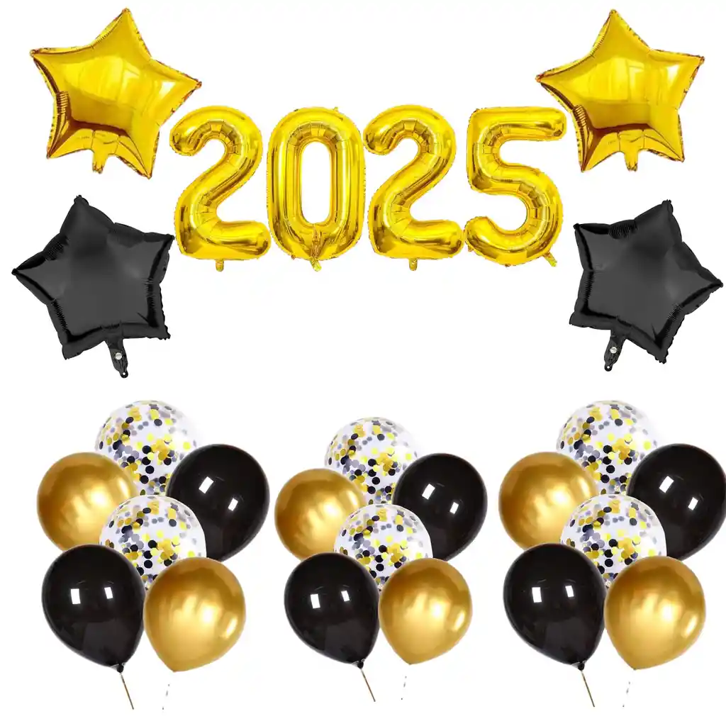 Kit para celebrar el año Nuevo 5 globos de latex negros 5 globos de latex dorados 5 globos de latex con confeti 2 globos de estrellas metalizadas doradas de 45 cm 2 globos de estrellas metalizadas negro de 45 cm 2025 en Globos de 80 cm dorados Nota: Globos se envían sin inflar Si deseas adicionar otros Artículos a tu compra puedes escribirnos, para poder ayudarte.