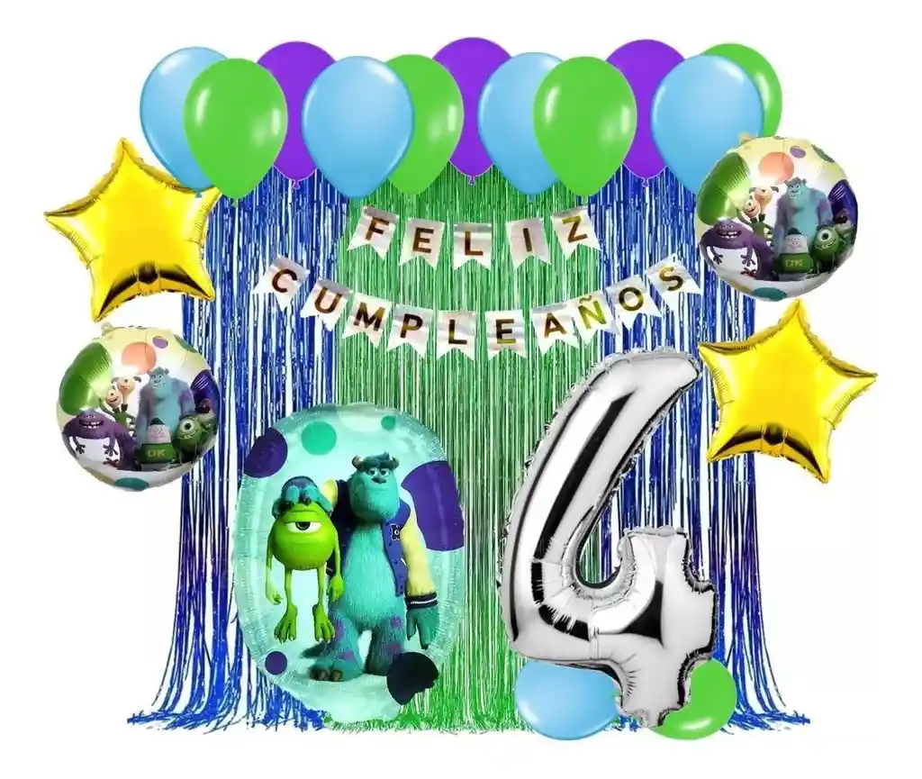*********************GLOBOS Y PELUCHES MASMELO********************* Somos Mercado Lider Platinum Por tu compra te llevas: 1 Cortina azul flecos 2x1 metros 1 Cortina verde flecos 2x1 metros 1 Feston azul cumpleaños 2 metros de largo 2 Globo estrella dorado 45x45cm 3 Globo circular temática Monsters INC 45x45cm 1 Globo número plateado número segun tu elección 82 cm de altura 12 Globo morado 30cm 12 Globo verde fashion 30cm 12 Globo azul celeste 30cm 1 Cinta de Arco 5 metros 1 Instructivo de armado de kit