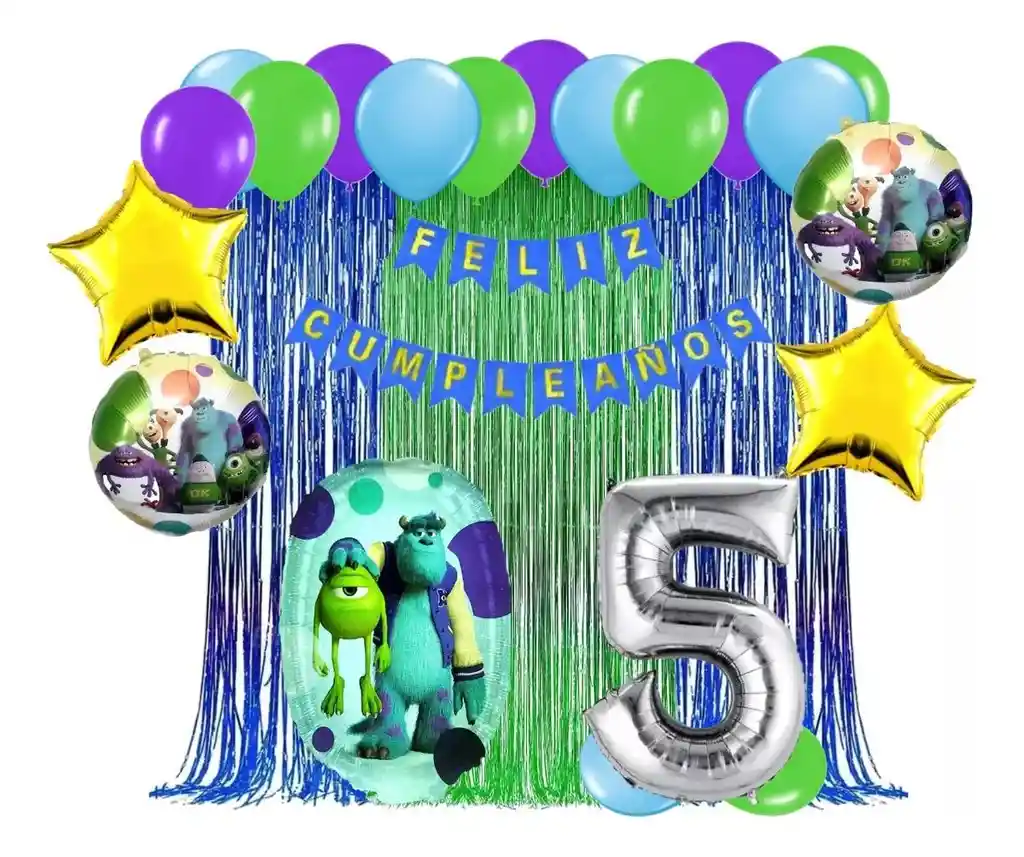 *********************GLOBOS Y PELUCHES MASMELO********************* Somos Mercado Lider Platinum Por tu compra te llevas: 1 Cortina azul flecos 2x1 metros 1 Cortina verde flecos 2x1 metros 1 Feston azul cumpleaños 2 metros de largo 2 Globo estrella dorado 45x45cm 3 Globo circular temática Monsters INC 45x45cm 1 Globo número plateado número segun tu elección 82 cm de altura 12 Globo morado 30cm 12 Globo verde fashion 30cm 12 Globo azul celeste 30cm 1 Cinta de Arco 5 metros 1 Instructivo de armado de kit