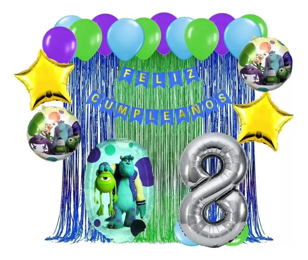 *********************GLOBOS Y PELUCHES MASMELO********************* Somos Mercado Lider Platinum Por tu compra te llevas: 1 Cortina azul flecos 2x1 metros 1 Cortina verde flecos 2x1 metros 1 Feston azul cumpleaños 2 metros de largo 2 Globo estrella dorado 45x45cm 3 Globo circular temática Monsters INC 45x45cm 1 Globo número plateado número segun tu elección 82 cm de altura 12 Globo morado 30cm 12 Globo verde fashion 30cm 12 Globo azul celeste 30cm 1 Cinta de Arco 5 metros 1 Instructivo de armado de kit