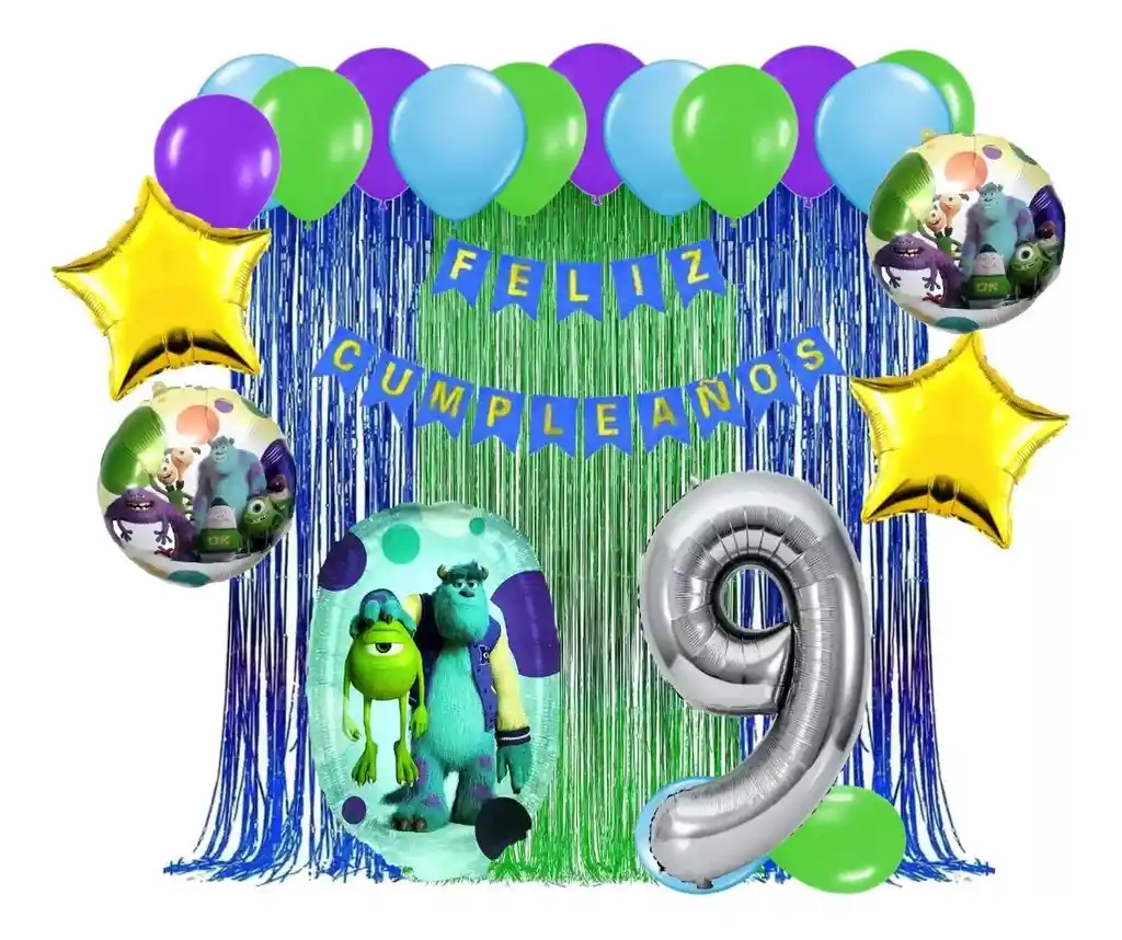 *********************GLOBOS Y PELUCHES MASMELO********************* Somos Mercado Lider Platinum Por tu compra te llevas: 1 Cortina azul flecos 2x1 metros 1 Cortina verde flecos 2x1 metros 1 Feston azul cumpleaños 2 metros de largo 2 Globo estrella dorado 45x45cm 3 Globo circular temática Monsters INC 45x45cm 1 Globo número plateado número segun tu elección 82 cm de altura 12 Globo morado 30cm 12 Globo verde fashion 30cm 12 Globo azul celeste 30cm 1 Cinta de Arco 5 metros 1 Instructivo de armado de kit