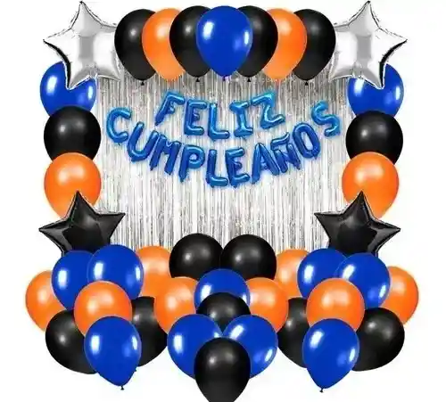 *********************GLOBOS Y PELUCHES MASMELO********************* Por tu compra te llevas. 2 Cortina flecos plateado 1×2 metros 1 Globo letrero feliz cumpleaños azul 40 cm 2 Globo negro estrella 45x45cm 2 Globo plateado estrella 45x45cm 35 Globo azul rey 30 cm 30 Globo negro 30 cm 30 Globo naranja 30 cm 7 metros Nylon 1 cinta 100 puntos adhesivos *Los globos se entregan desinflados, tu compra no incluye el montaje ni la decoración, el servicio de armado no lo tenemos disponible. sin embargo te damos todas las instrucciones para hacer de modo profesional. Si deseas adicionar otros articulos a tu compra puedes escribirnos, recuerda que Somos Globos y Peluches Masmelo Si necesitas variación en los colores, colocar un número, más globos o realizar otros cambios en el diseño original escribenos para ver si podemos hacerlo. Tenemos todo lo necesario para tus decoraciones, somos lo último en tendencias mundiales decorativas. Tenemos disponible: Vasos, platos, manteles, guirnaldas, cubiertos, globos de todo tipo, números, letreros, vela, Etc. Puedes encontrar los articulos de nuestra tienda en el siguiente link, copia y pega, si no encuentas lo que necesitas escribenos: https://www.rappi.com.co/tiendas/900280040-globosypeluchesmasmelo-mt-enc/decoracion-para-fiestas/globos-y-bombas