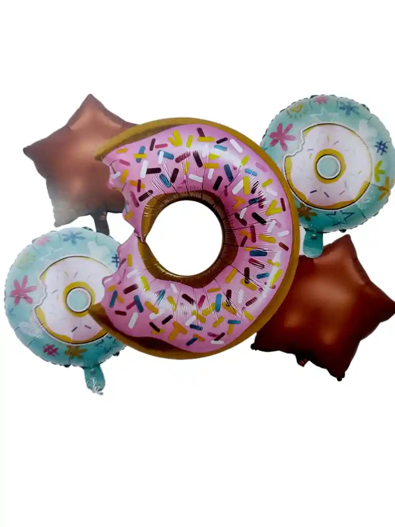 Kit globos para cumpleaños o diferentes ocasiones 2 Donas 45 cm 2 Estrellas 45 cm 1 Dona con mordida Tamaño 48*73cm Nota: Los globos se despachan sin inflar