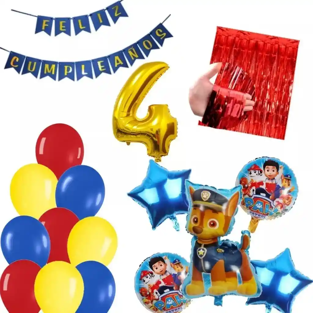 *********************GLOBOS Y PELUCHES MASMELO********************* Por tu compra te llevas. 1 Cortina flecos rojo 1×2 metros 1 Globo número dorado 82 cm 1 Globo feston feliz cumpleaños 2 metros de largo 3 Globo rojo 30 cm 3 Globo amarillo 30 cm 3 Globo azul 30 cm 2 Globo estrella azul 45x45cm 2 Globo circular temática patrulla canina 45x45cm 1 Globo perro policia Chase 65x45cm *Los globos se entregan desinflados, tu compra no incluye el montaje ni la decoración, el servicio de armado no lo tenemos disponible. sin embargo te damos todas las instrucciones para hacer de modo profesional. Si deseas adicionar otros articulos a tu compra puedes escribirnos, recuerda que Somos Globos y Peluches Masmelo Si necesitas variación en los colores, colocar un número, más globos o realizar otros cambios en el diseño original escribenos para ver si podemos hacerlo. Tenemos todo lo necesario para tus decoraciones, somos lo último en tendencias mundiales decorativas. Tenemos disponible: Vasos, platos, manteles, guirnaldas, cubiertos, globos de todo tipo, números, letreros, vela, Etc. Puedes encontrar los articulos de nuestra tienda en el siguiente link, copia y pega, si no encuentas lo que necesitas escribenos: https://www.rappi.com.co/tiendas/900280040-globosypeluchesmasmelo-mt-enc/decoracion-para-fiestas/globos-y-bombas