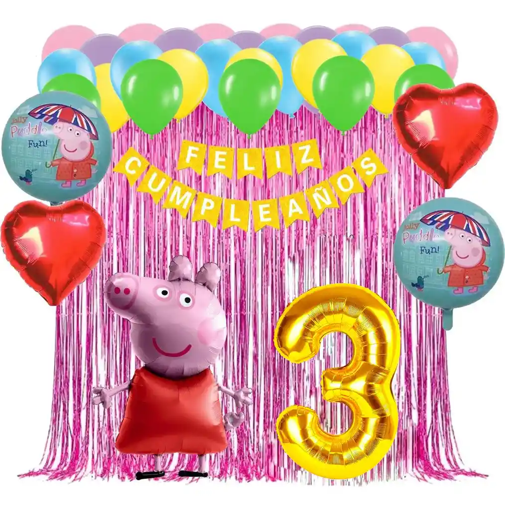 *********************GLOBOS Y PELUCHES MASMELO********************* Somos Mercado Lider Platinum Por tu compra te llevas: 1 Feston dorado cumpleaños 2 metros de largo 2 Cortina flecos fucsia 2x1 metros 1 Globo Peppa Pig 65x45cm 2 Globo corazón rojo 45x45cm 2 Globo circular temática Peppa Pig 45x45cm 8 Globo rosado pastel 30cm 8 Globo verde lima 30cm 8 Globo azul pastel 30cm 8 Globo amarillo 30cm 8 Globo morado pastel 30cm 1 Globo número dorado número segun tu elección 82 cm altura 1 Cinta de Arco 5 metros 1 Instructivo de armado de kit