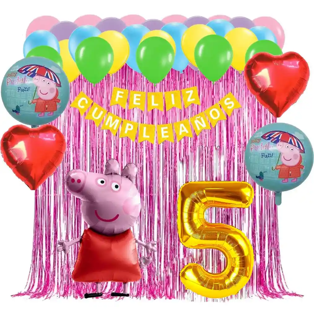 *********************GLOBOS Y PELUCHES MASMELO********************* Somos Mercado Lider Platinum Por tu compra te llevas: 1 Feston dorado cumpleaños 2 metros de largo 2 Cortina flecos fucsia 2x1 metros 1 Globo Peppa Pig 65x45cm 2 Globo corazón rojo 45x45cm 2 Globo circular temática Peppa Pig 45x45cm 8 Globo rosado pastel 30cm 8 Globo verde lima 30cm 8 Globo azul pastel 30cm 8 Globo amarillo 30cm 8 Globo morado pastel 30cm 1 Globo número dorado número segun tu elección 82 cm altura 1 Cinta de Arco 5 metros 1 Instructivo de armado de kit