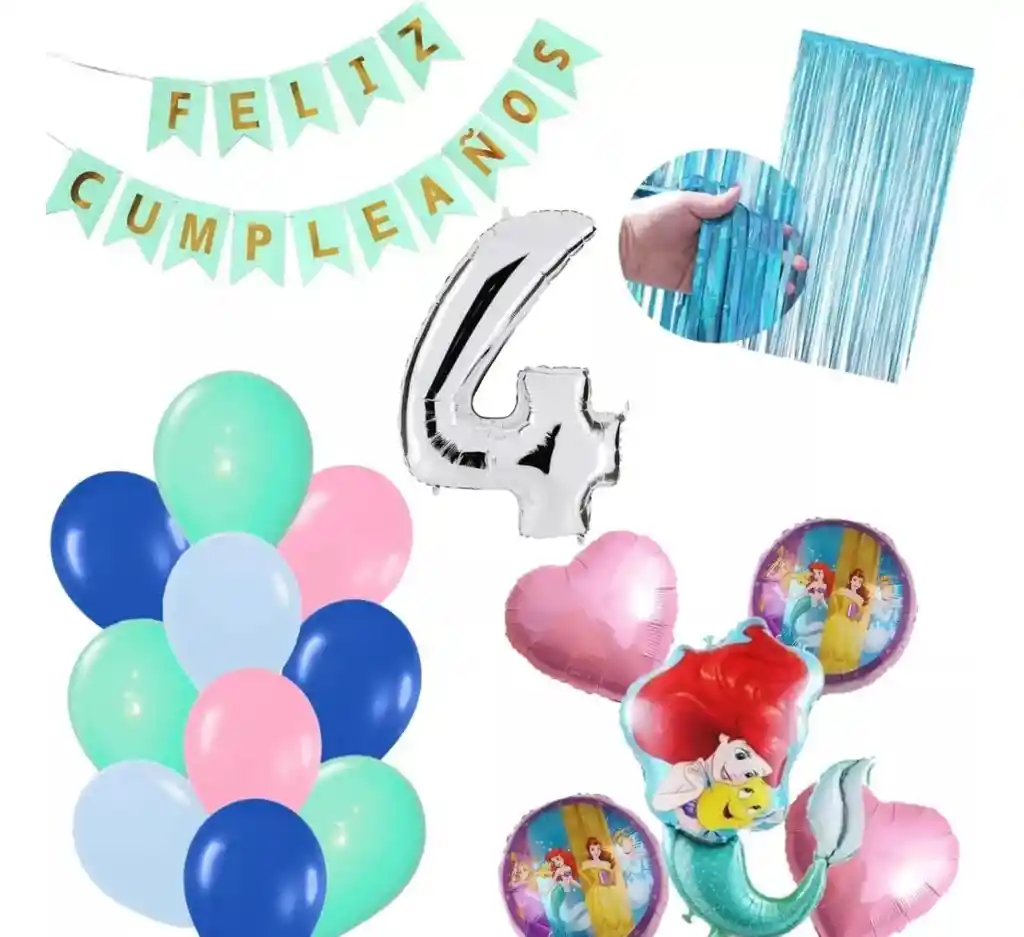 *********************GLOBOS Y PELUCHES MASMELO********************* Por tu compra te llevas. 1 Feston feliz cumpleaños 2 metros de largo 1 Cortina flecos azul 1×2 metros 1 Globo número plateado 82cm 2 Globo temática princesas 45x45cm 2 Globo corazon rosado 45x45cm 1 Globo Ariel 65x45cm 3 Globo verde agua Marina 30 cm 3 Globo azul rey 30 cm 3 Globo rosado 30 cm 3 Globo blanco 30 cm *Los globos se entregan desinflados, tu compra no incluye el montaje ni la decoración, el servicio de armado no lo tenemos disponible. sin embargo te damos todas las instrucciones para hacer de modo profesional. Si deseas adicionar otros articulos a tu compra puedes escribirnos, recuerda que Somos Globos y Peluches Masmelo Si necesitas variación en los colores, colocar un número, más globos o realizar otros cambios en el diseño original escribenos para ver si podemos hacerlo. Tenemos todo lo necesario para tus decoraciones, somos lo último en tendencias mundiales decorativas. Tenemos disponible: Vasos, platos, manteles, guirnaldas, cubiertos, globos de todo tipo, números, letreros, vela, Etc. Puedes encontrar los articulos de nuestra tienda en el siguiente link, copia y pega, si no encuentas lo que necesitas escribenos: https://www.rappi.com.co/tiendas/900280040-globosypeluchesmasmelo-mt-enc/decoracion-para-fiestas/globos-y-bombas